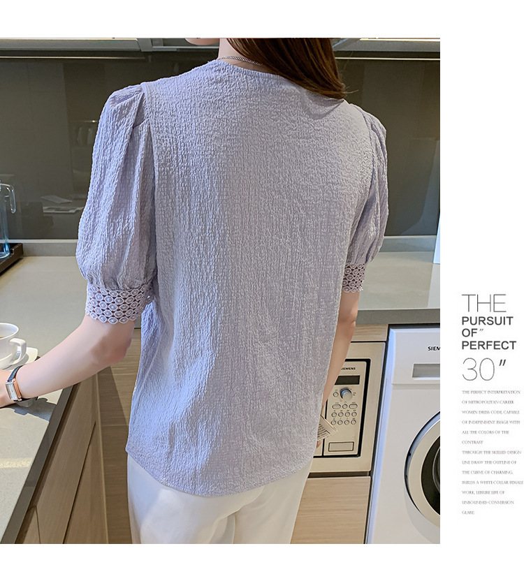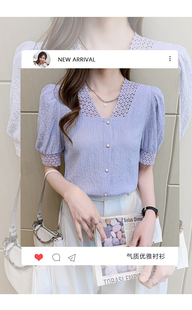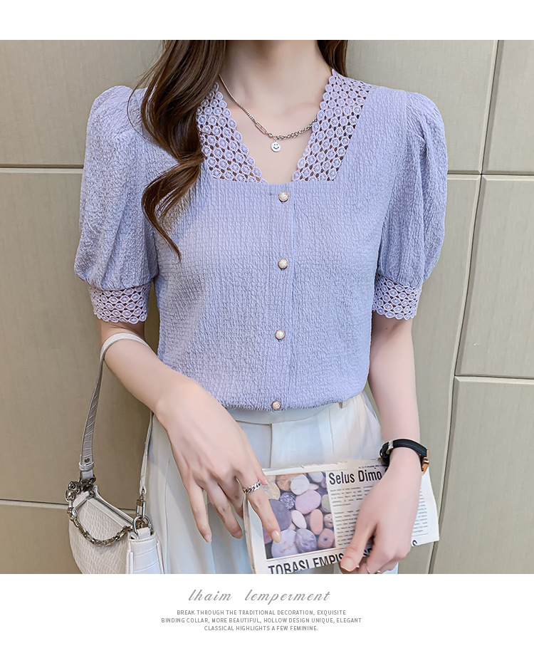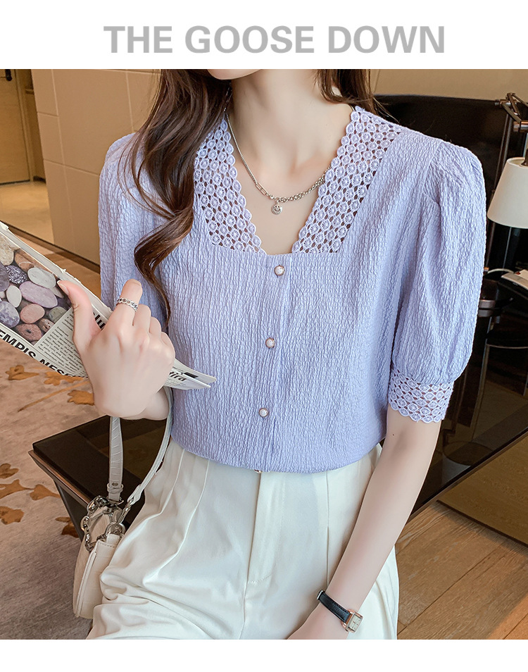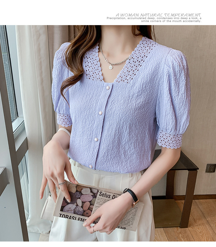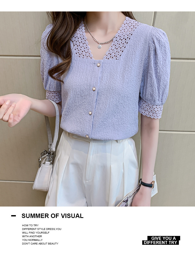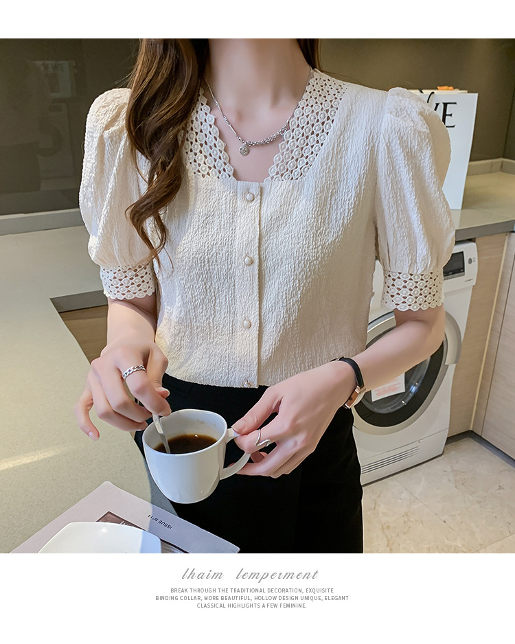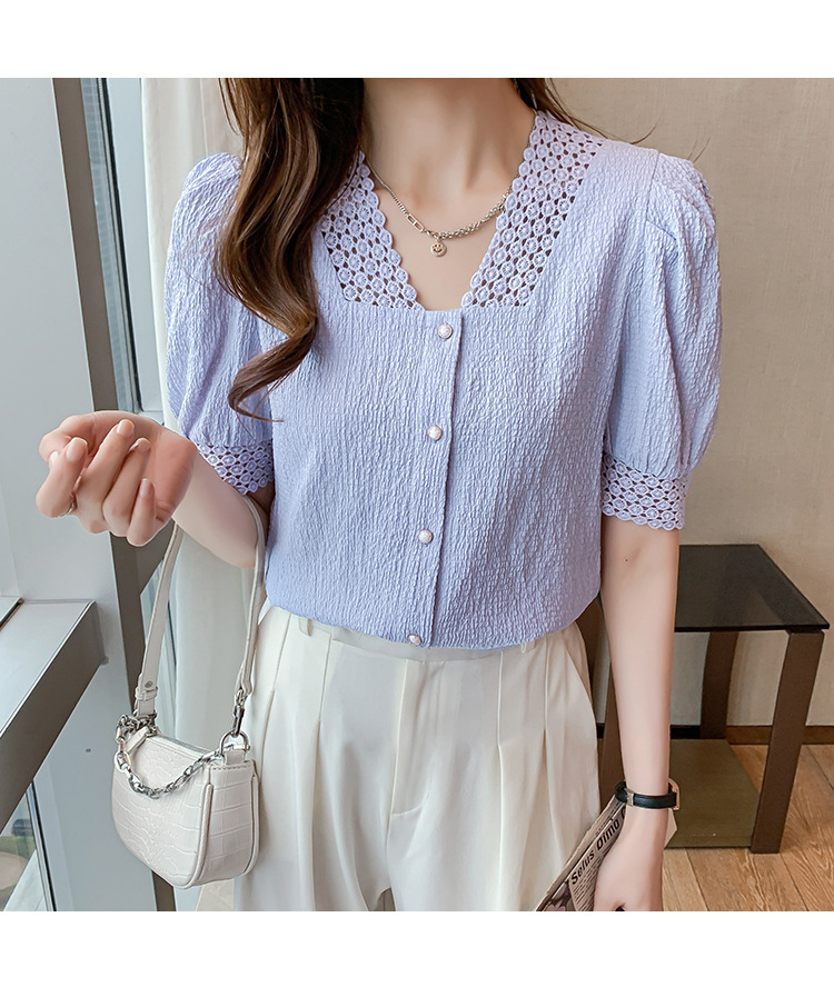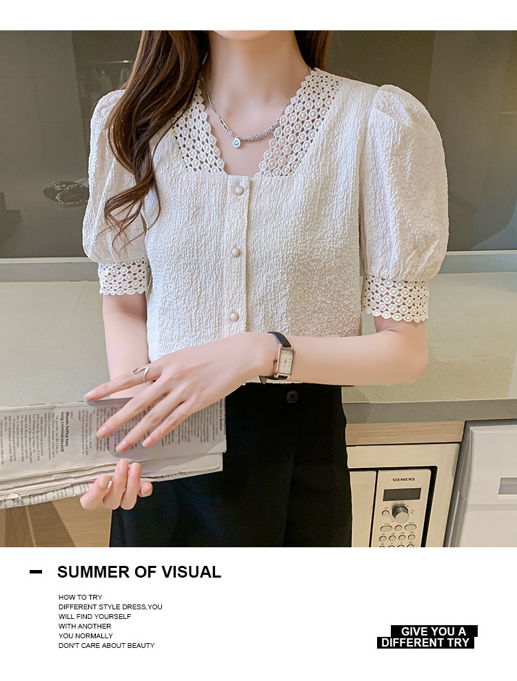 2026년 여름 신상 디자인 감각적인 니치 스타일 V넥 싱글 버튼 주름 퍼프 소매 짧은 레이스 블라우스 여성용스토어 가기