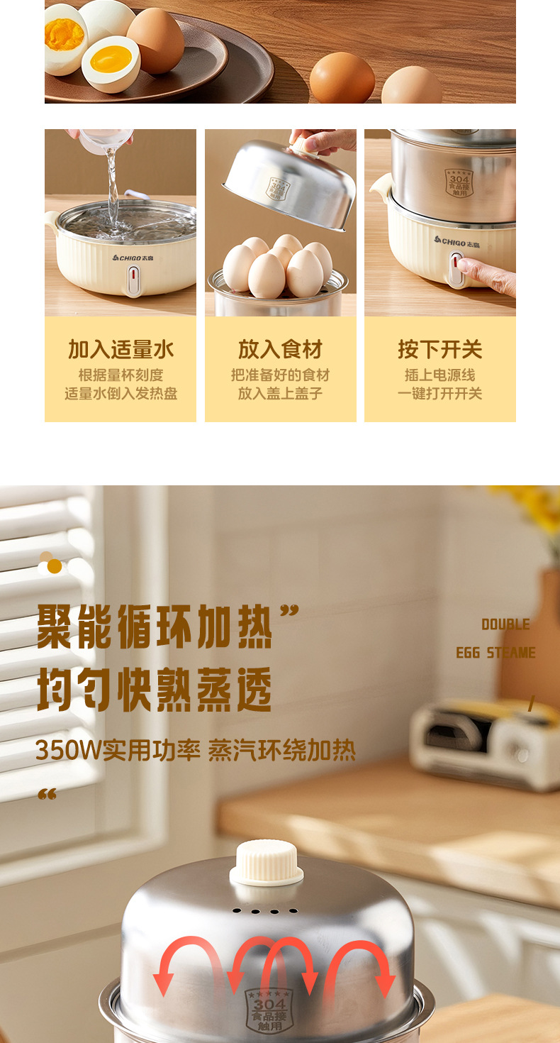 Chigo Timed 계란 보일러 자동 전원 끄기 소형 가정용 미니 찐 계란 아침 식사 계란 커스터드 기계 다기능 도매스토어 가기