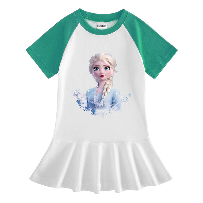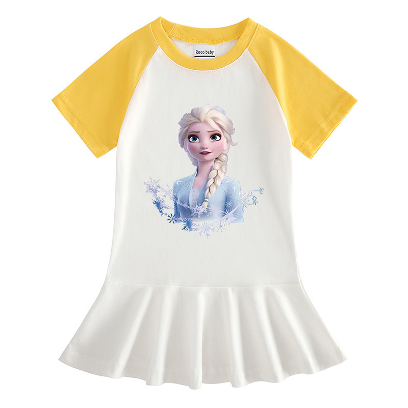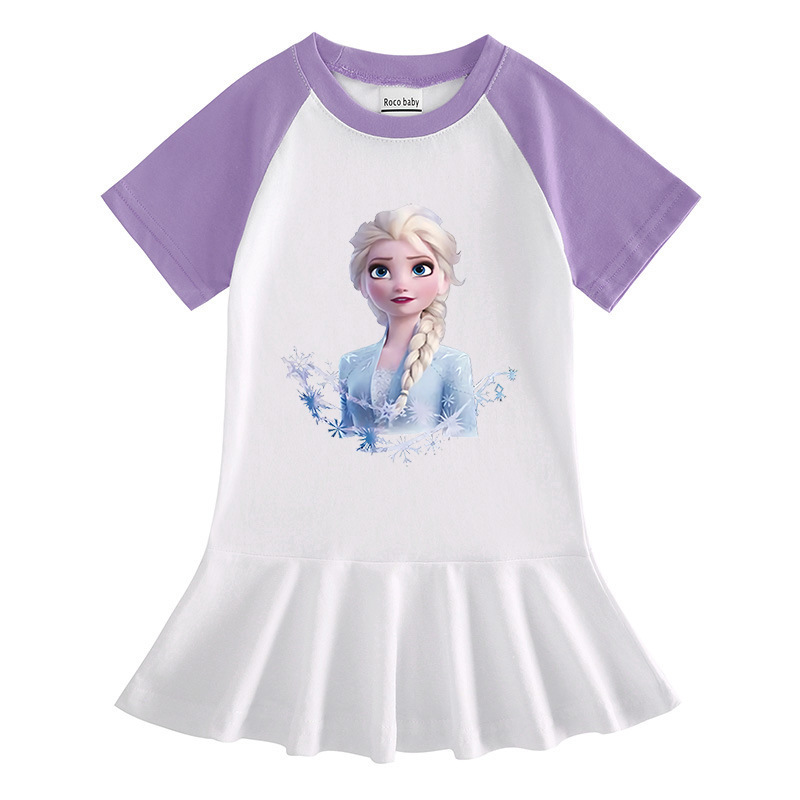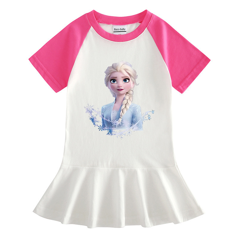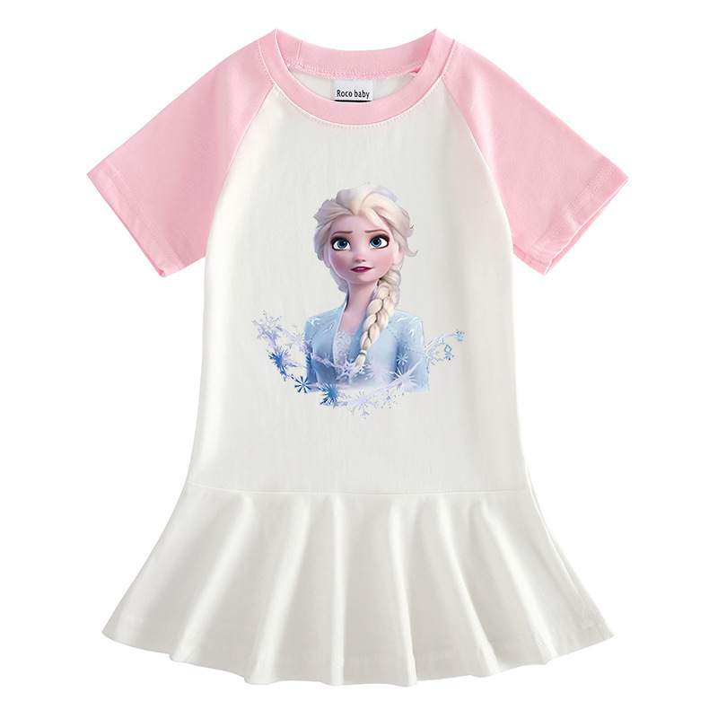 2023 얼음과 눈 여름 새로운 아동복 만화 반 소매 소녀 원피스 만화 아기 서양식 주름 치마스토어 가기