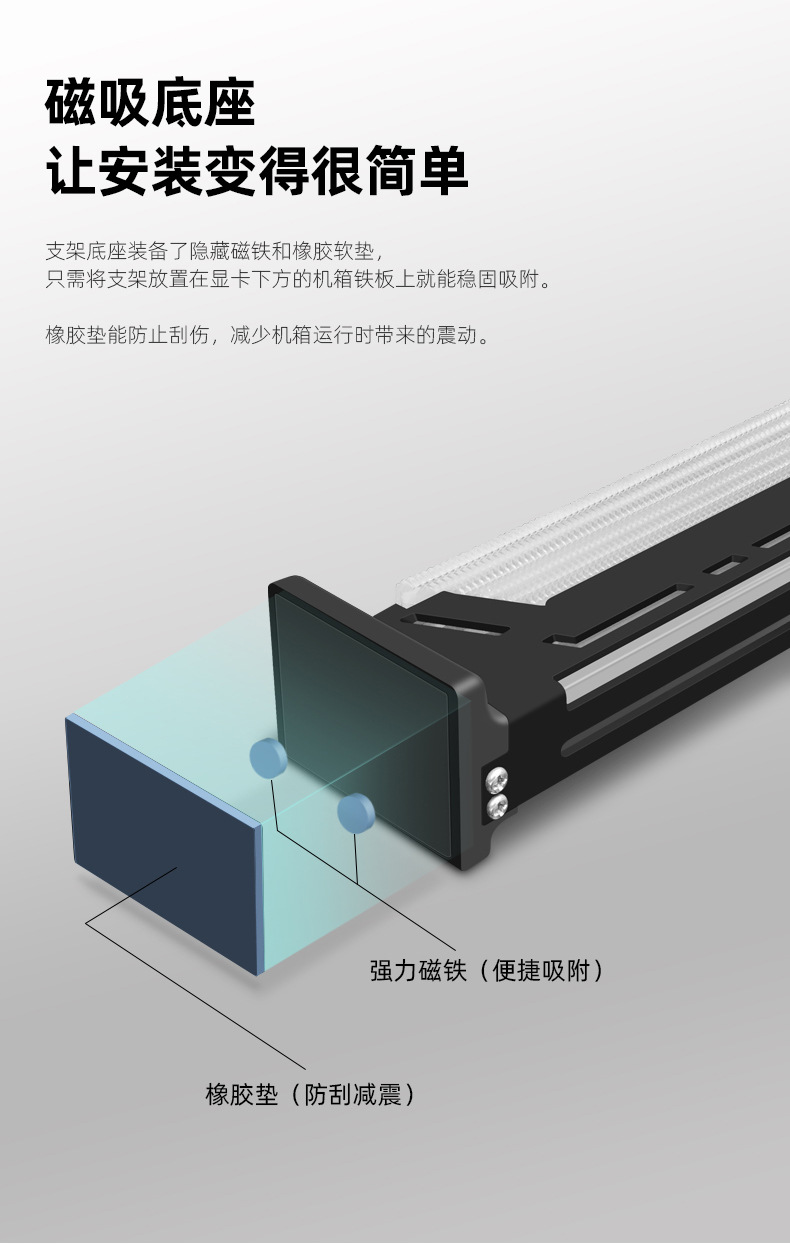 GH2立式显卡支架,ARGB炫酷发光,铝合金材质强固支撑,每个独立彩盒包装,单箱装60pcs,单箱尺寸:41*41*28.2cm,10.8kg/box,支持跨境销售和OEM,更多资讯请联系客服!【注意:小4P+5V3针公母接口和5V3针公母接口两个批次随机发货】