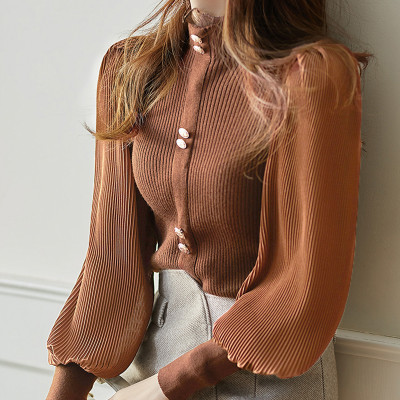 러플 쉬폰 스티칭 스웨터 여성용 2023 가을 새로운 한국 스타일 세련된 연령 감소 탑 퍼프 슬리브 니트 스웨터