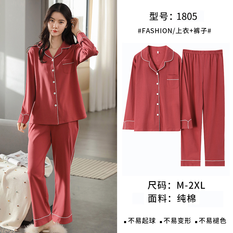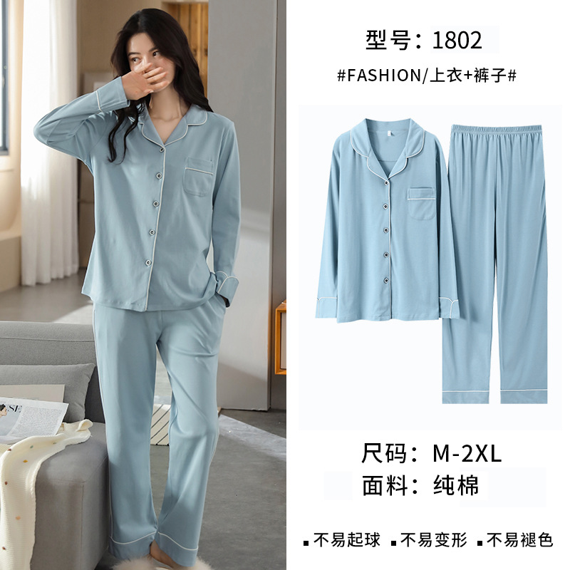 순면 여자의 잠옷 봄과 가을 긴 소매 순면 단색 여자의 한국 스타일 카디건 옷깃 가정 의류 여자의 세트스토어 가기