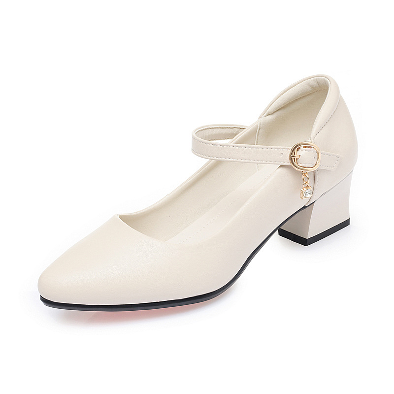 봄과 가을 새로운 한국식 미드 힐 소가죽 얕은 입 작업 신발 두꺼운 굽 마마 신발 댄싱 신발 스트레이트 버클이있는 여성용 싱글 레이어 신발