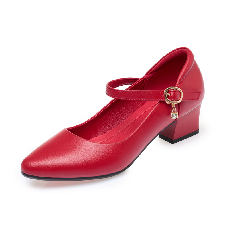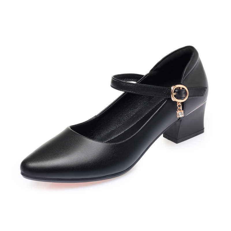 봄과 가을 새로운 한국식 미드 힐 소가죽 얕은 입 작업 신발 두꺼운 굽 마마 신발 댄싱 신발 스트레이트 버클이있는 여성용 싱글 레이어 신발스토어 가기