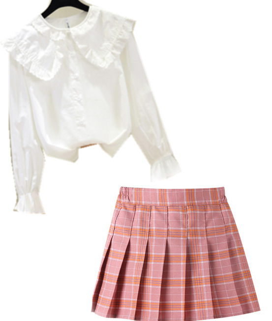 • 쉬폰 작은 레이스 + 핑크 체크 무늬 스커트