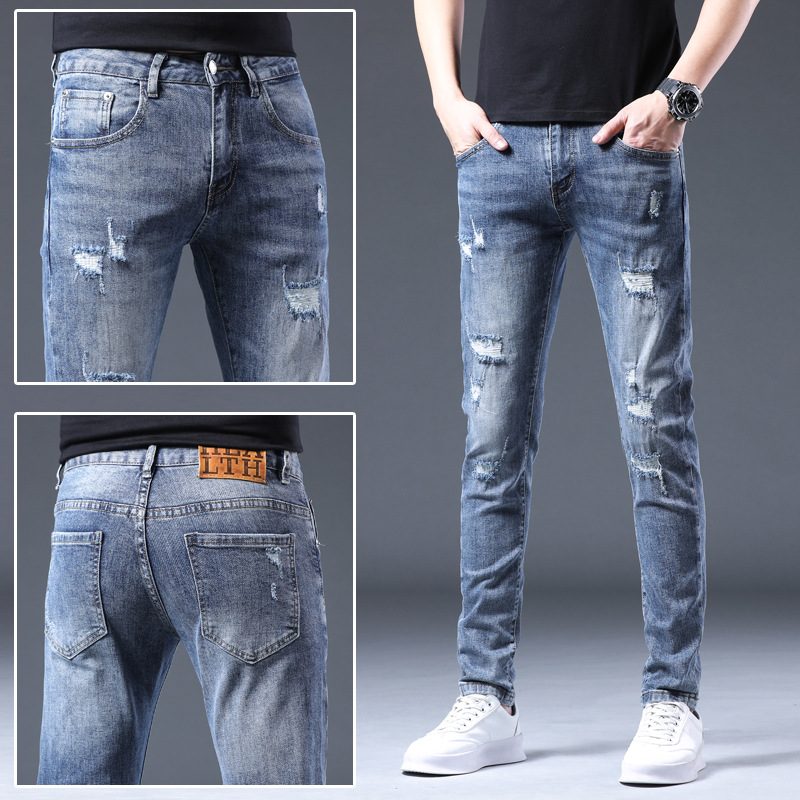 봄과 가을 찢어진 청바지 남성용 패치 면 캐주얼 트렌디 남성 청바지 청소년 스트레치 슬림 핏 청바지 남성용 작은 발스토어 가기