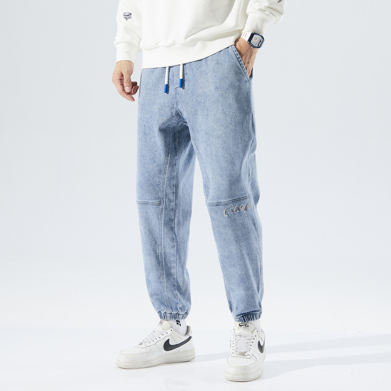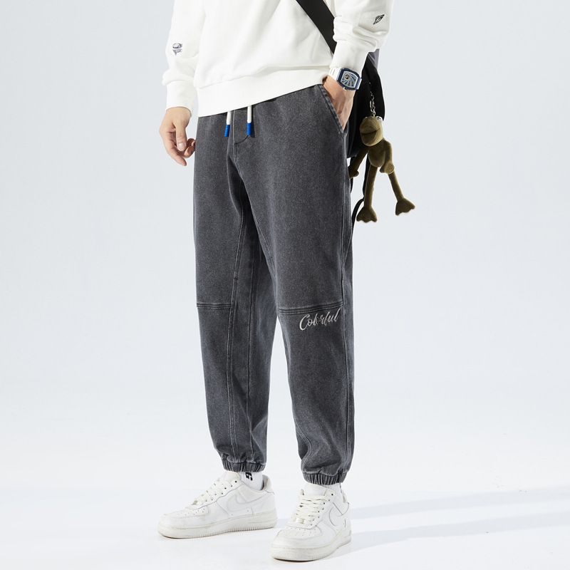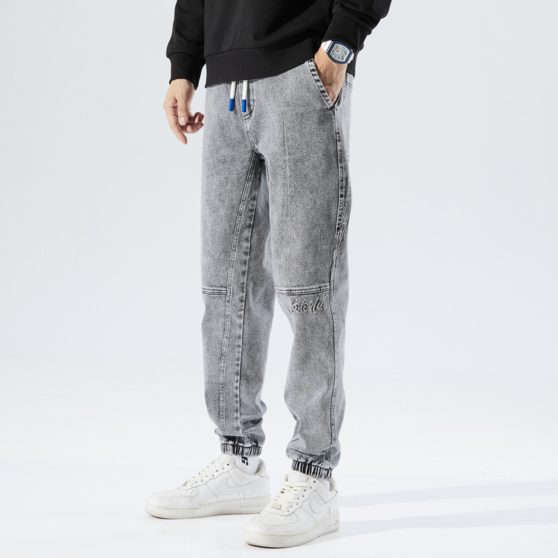 가을 캐주얼 미들 웨이스트 재고 블랙 코튼 마이크로 탄성 일반 바지 세탁 십대 청바지