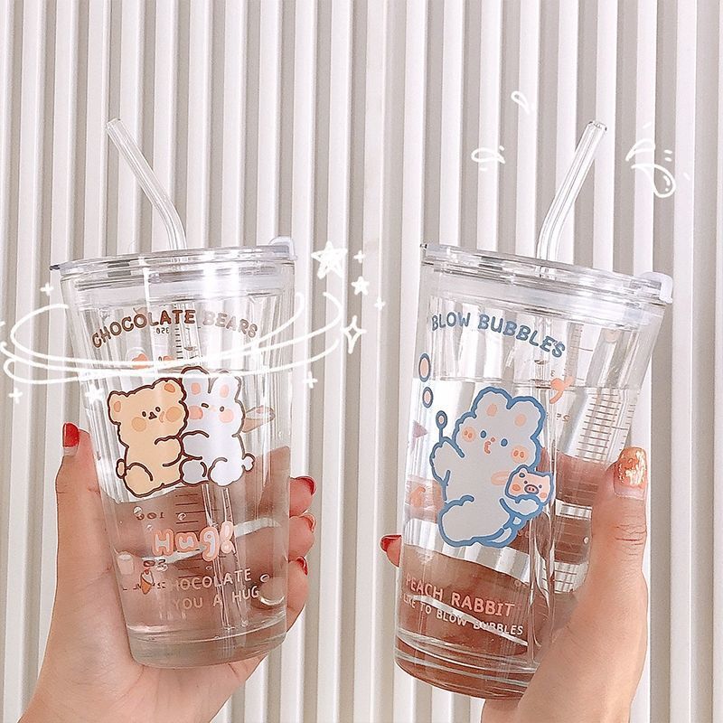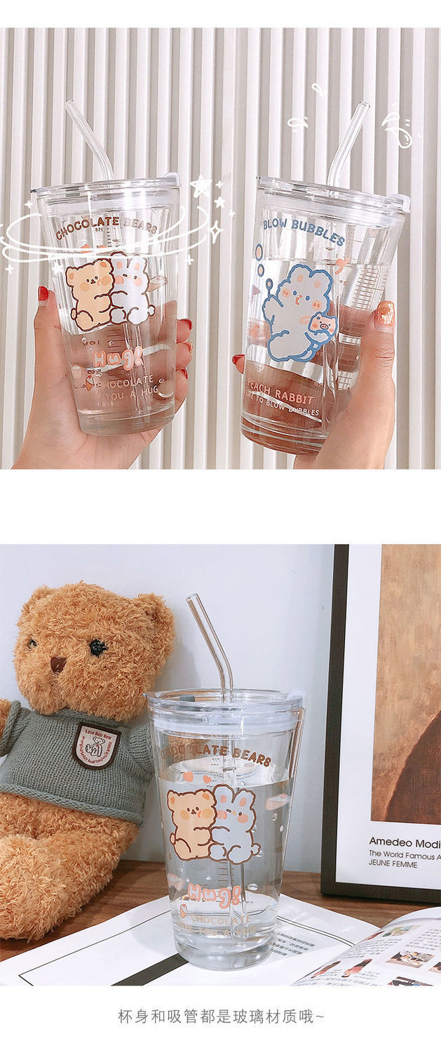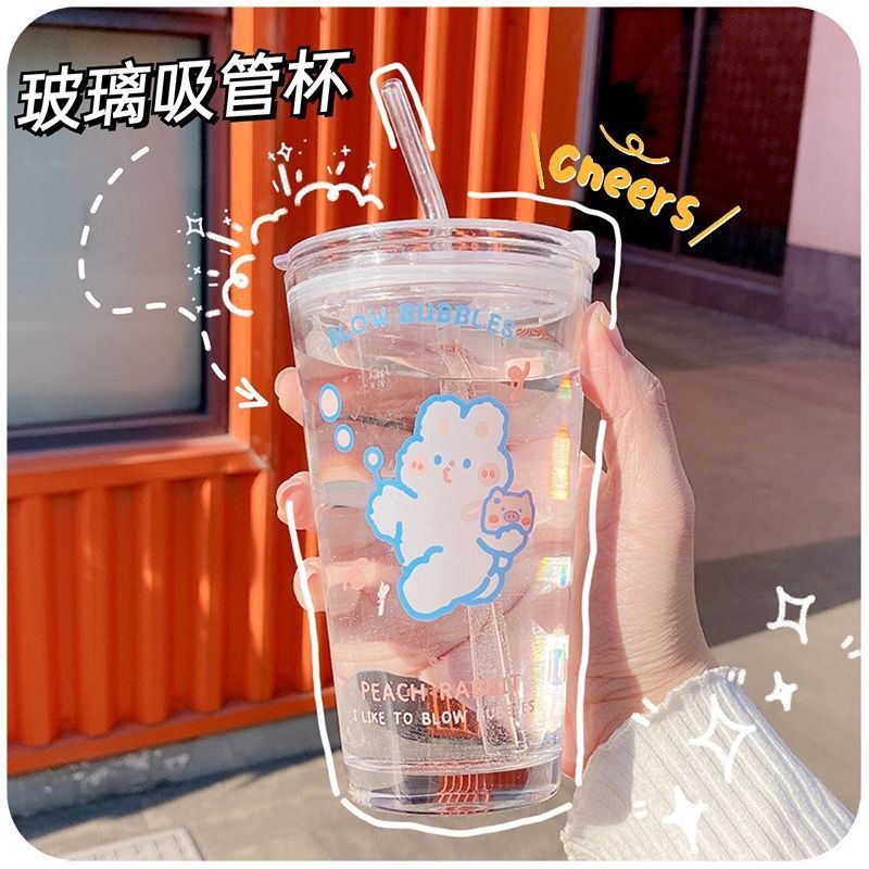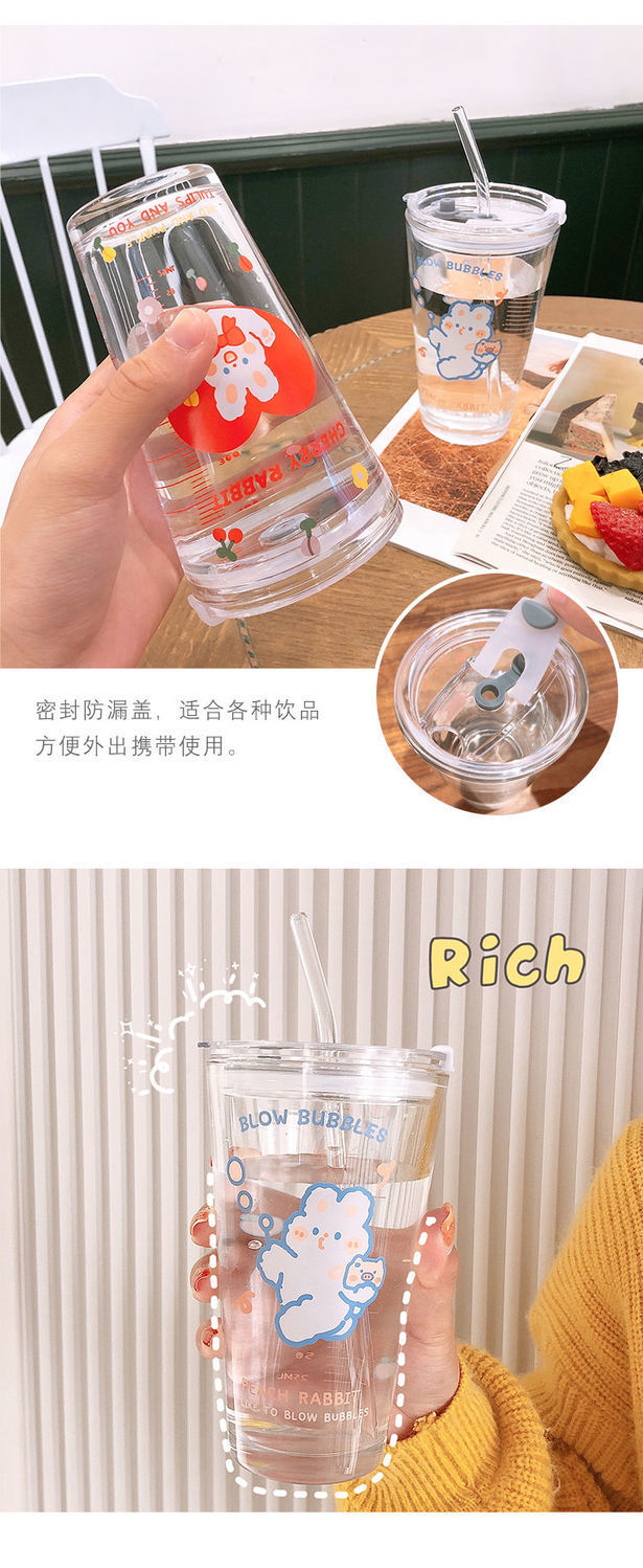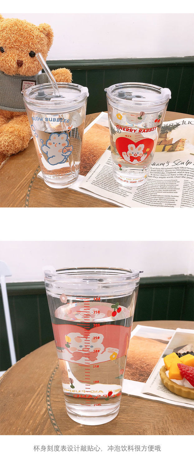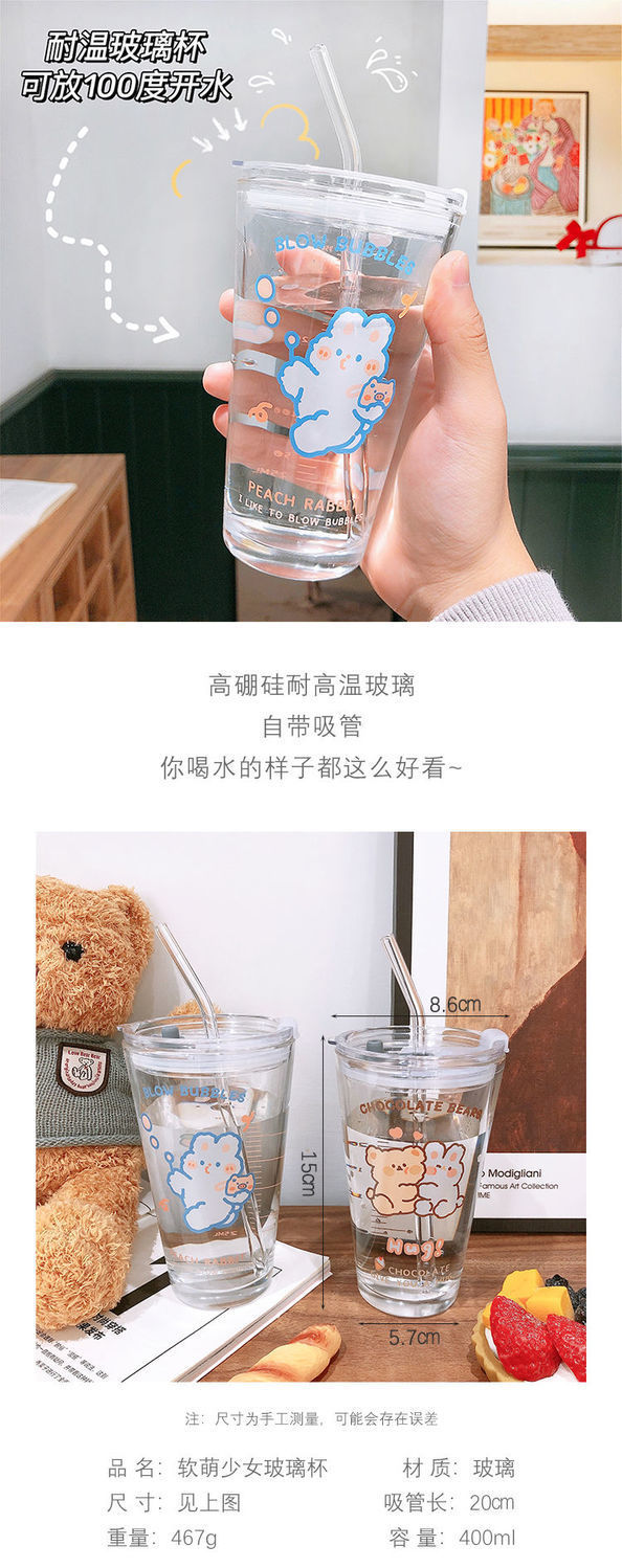 스타일 뚜껑과 빨대 소녀의 여름 물 컵 가정용 우유 아침 식사 휴대용 우유 차 컵과 귀여운 유리스토어 가기