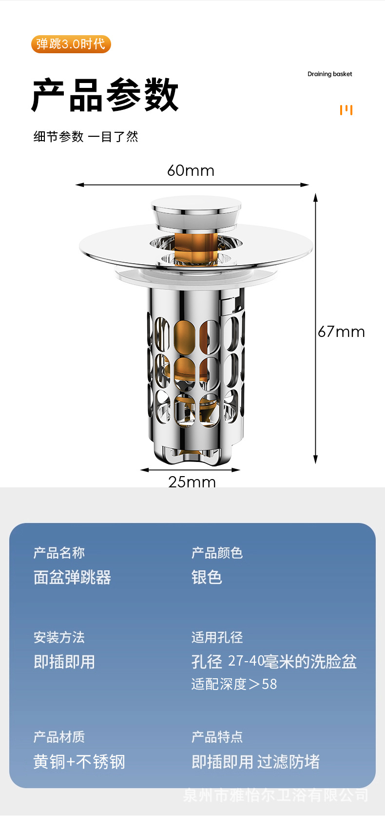 • 미국 규격 실버 - 방취형 소형 팝업 배수구 덮개 [황동 케이스, 황동 코어 - 스테인리스 스틸 망] [28-40구]