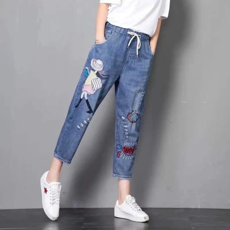 여름 새로운 복고풍 자수 스트레치 허리 하렘 바지 느슨한 슬리밍 자른 바지 예술적인 복고풍 청바지 여성