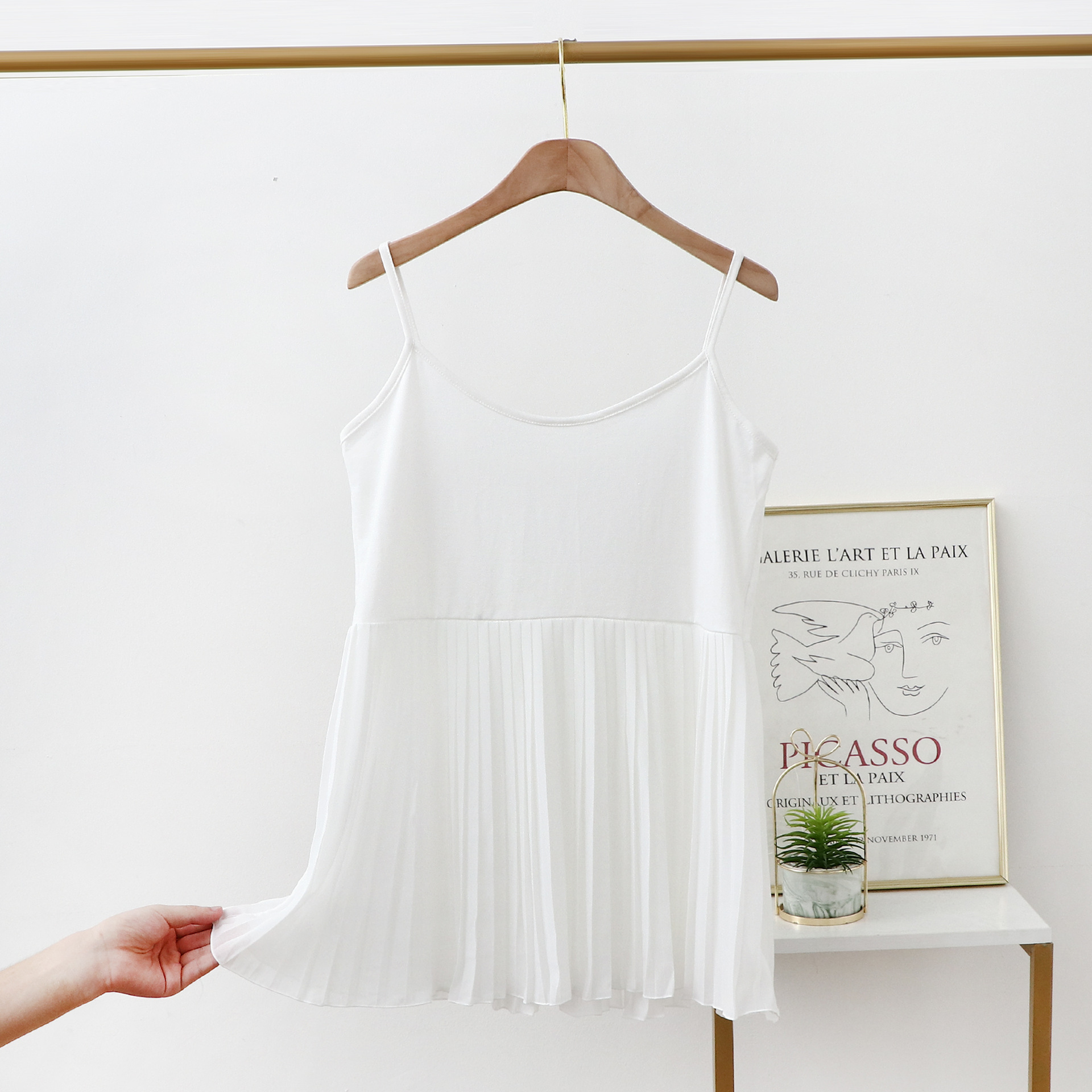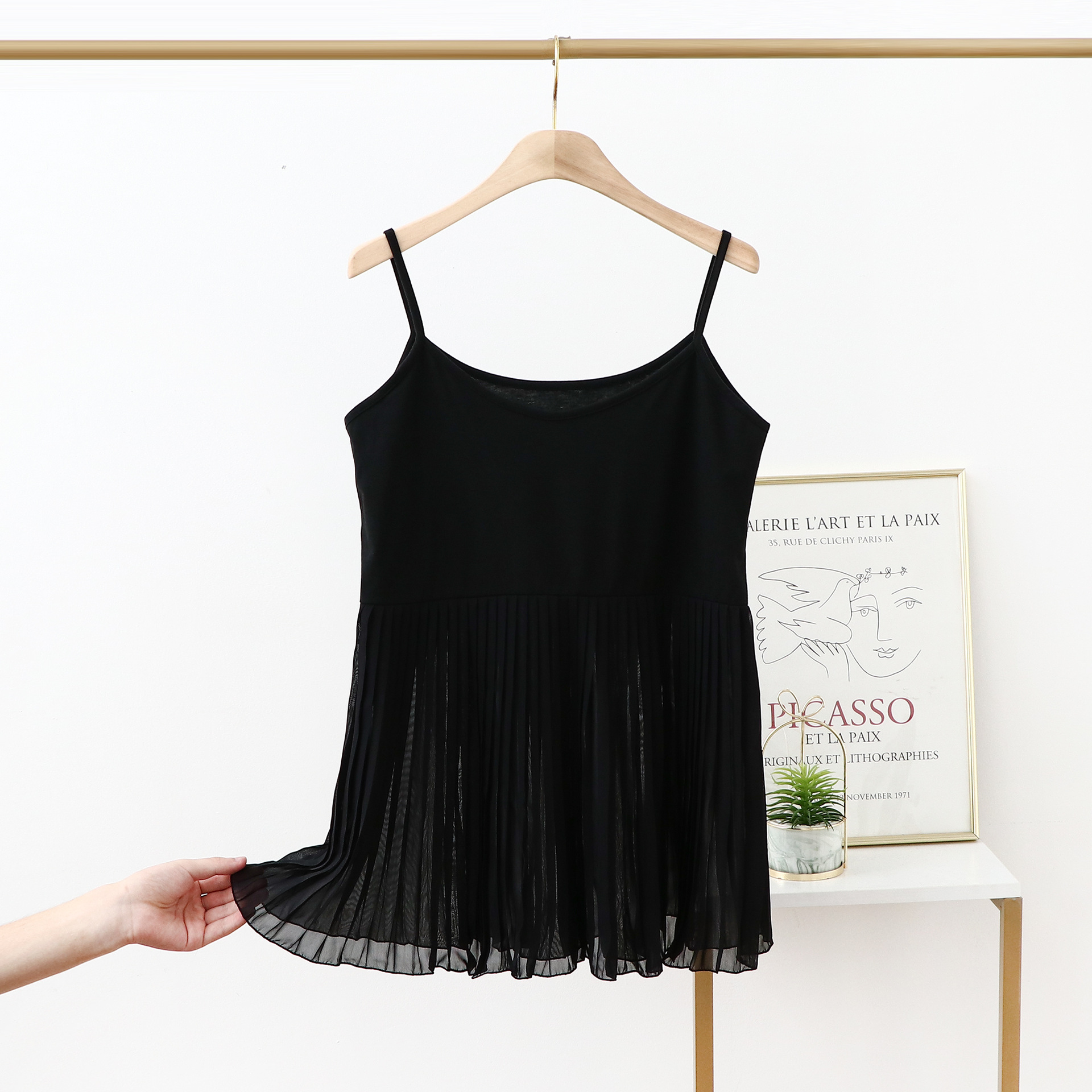 여름 새로운 쉬폰 플리츠 캐미솔 흑백 심플 솔리드 컬러 여성용 탑 코튼 스티치 달콤한 작은 내부 셔츠