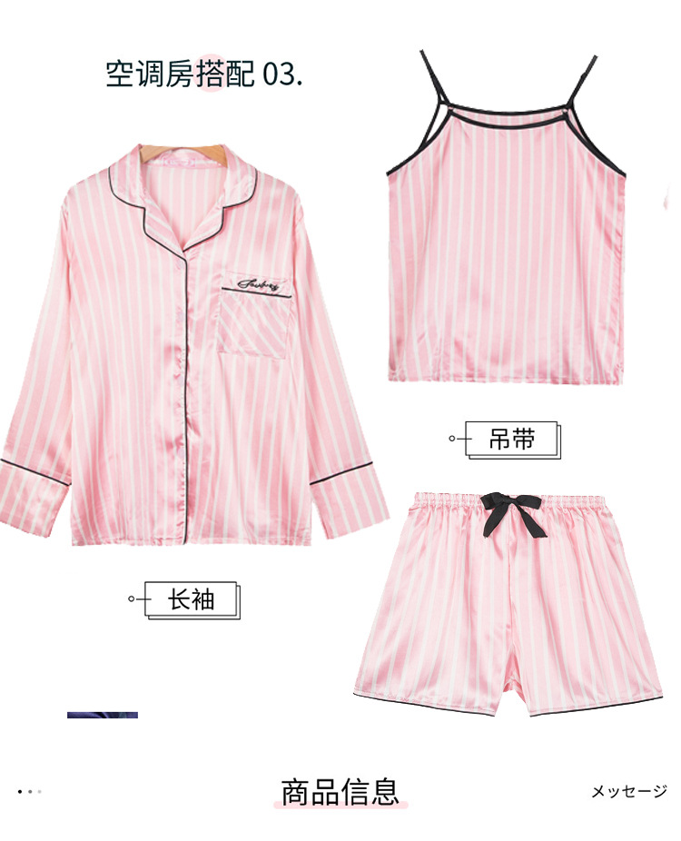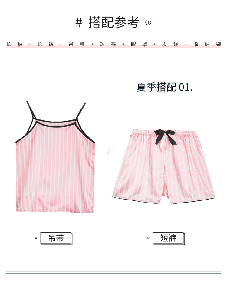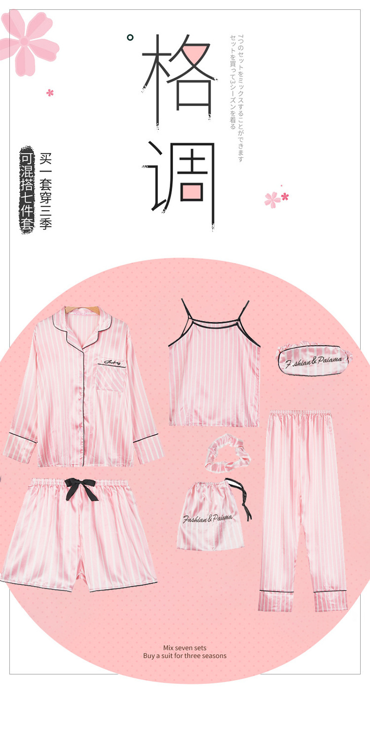 잠옷 여성용 스트라이프 7 종 세트 여성의 봄과 가을 긴팔 반바지 섹시 캐미솔 아이스 실크 가정 옷 세트