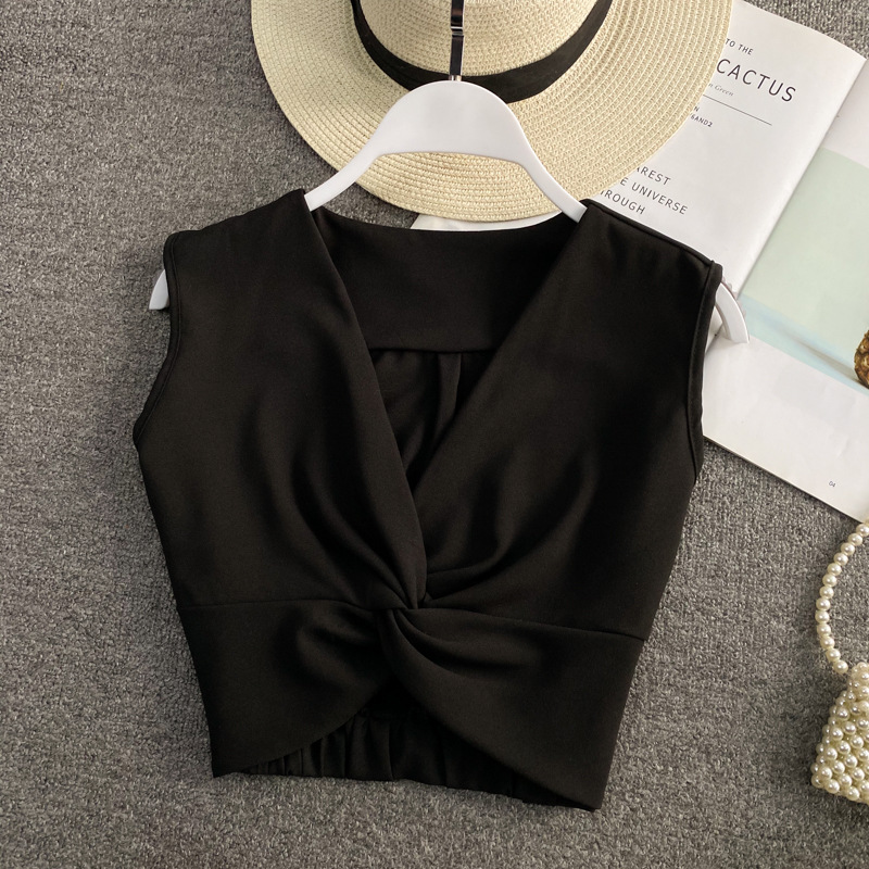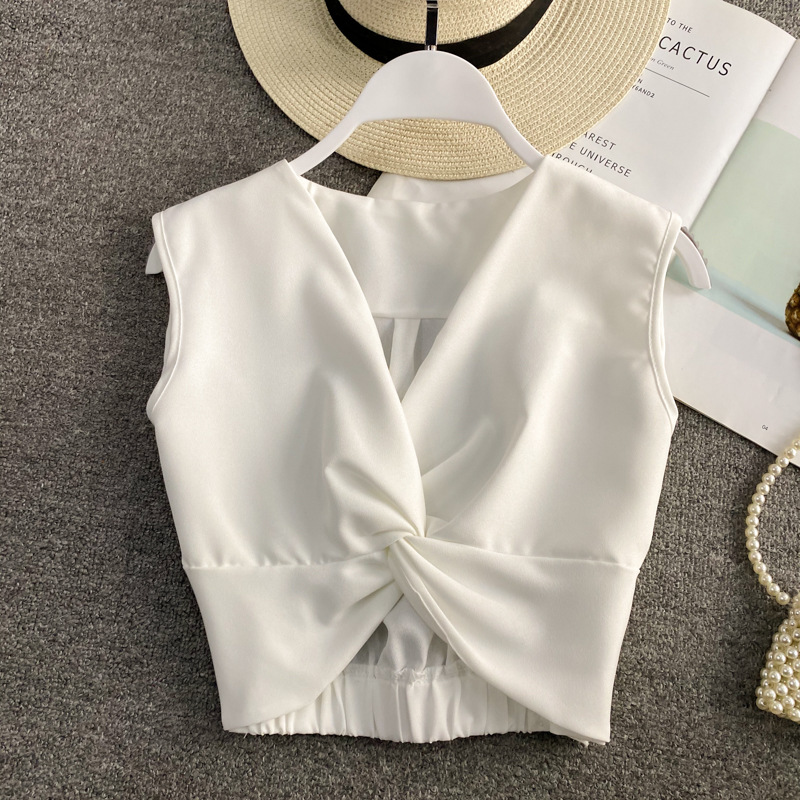 여자 쉬폰 조끼 여름 새로운 민소매 탑 크로스 V 넥 느슨한 세련된 슬림 핏 슬리밍 하이 웨이스트 쇼트