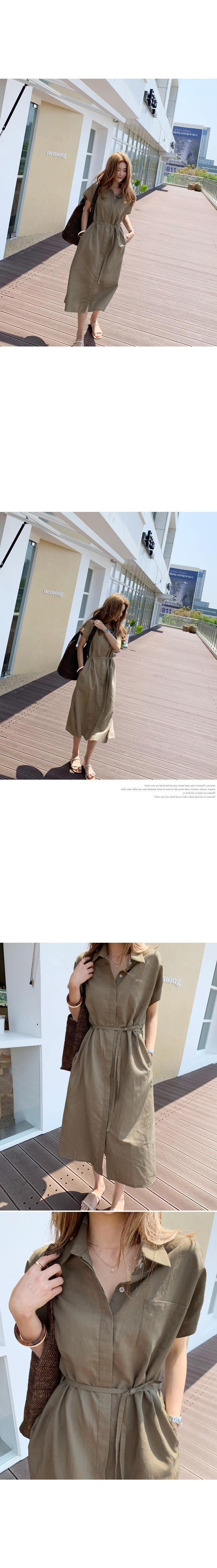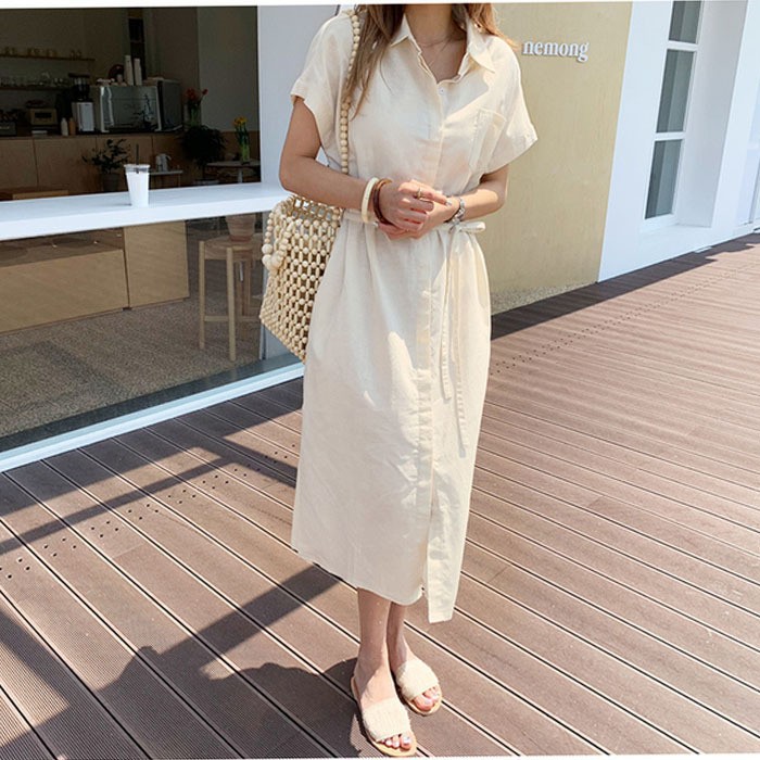 纯色韩版宽松单排扣系带腰带亚麻长款连衣裙衬衫