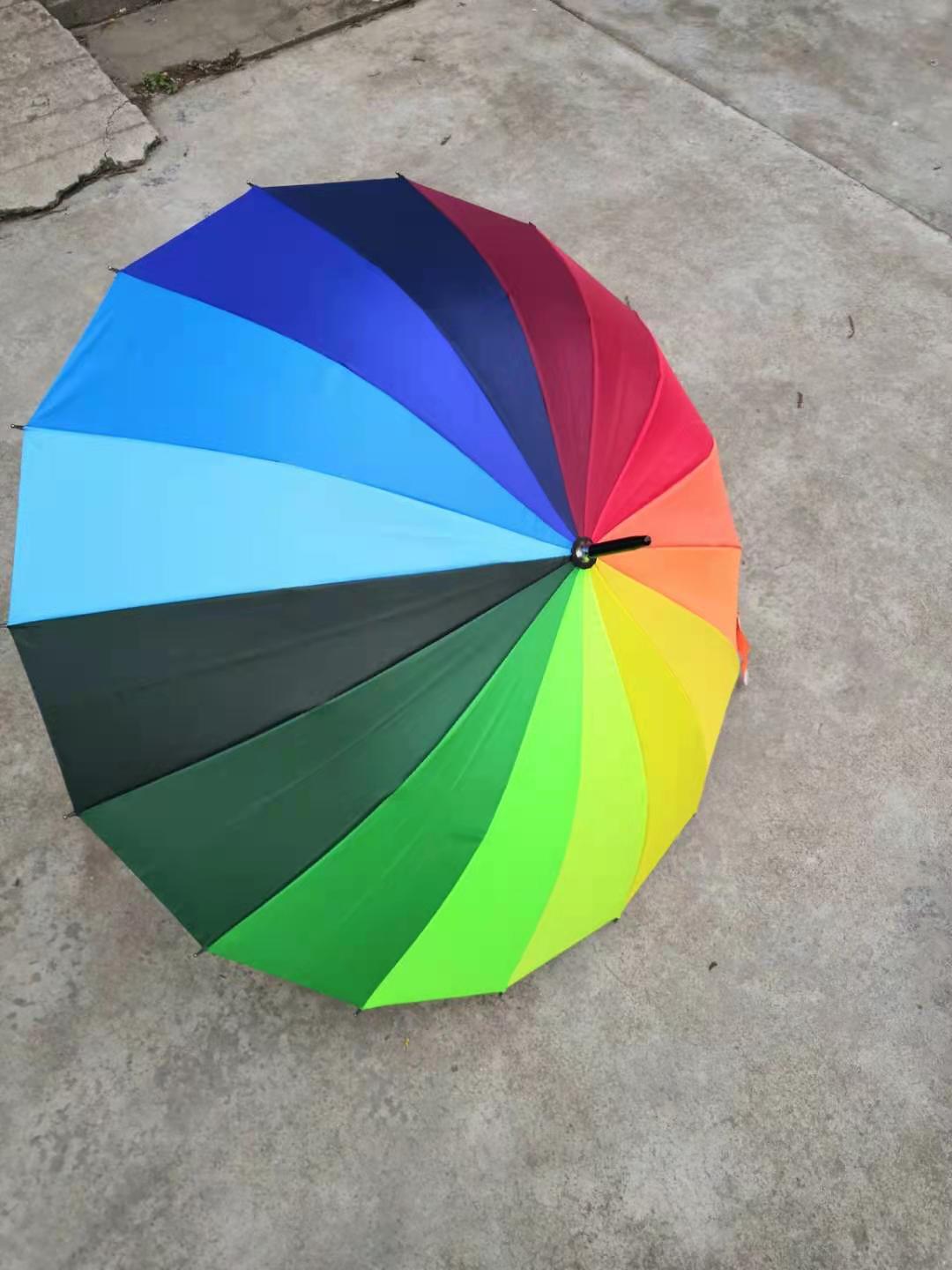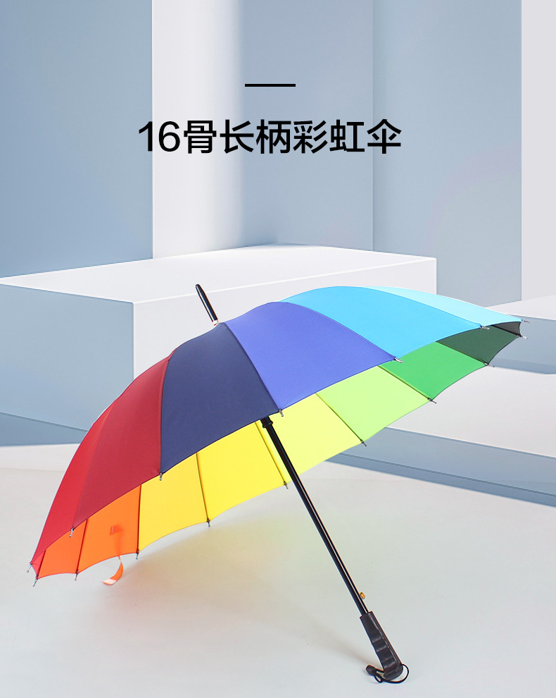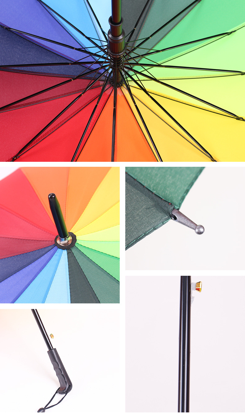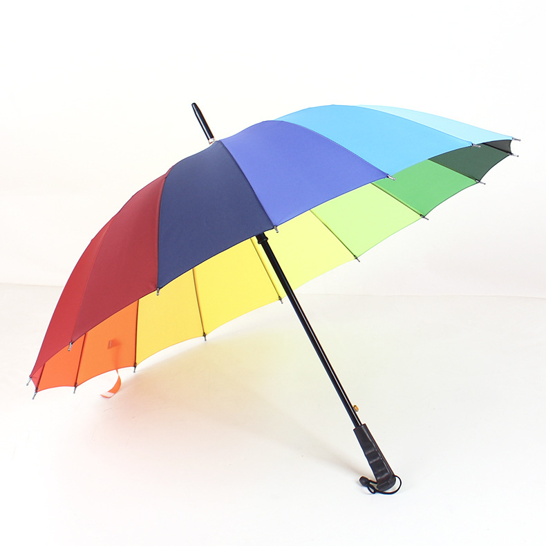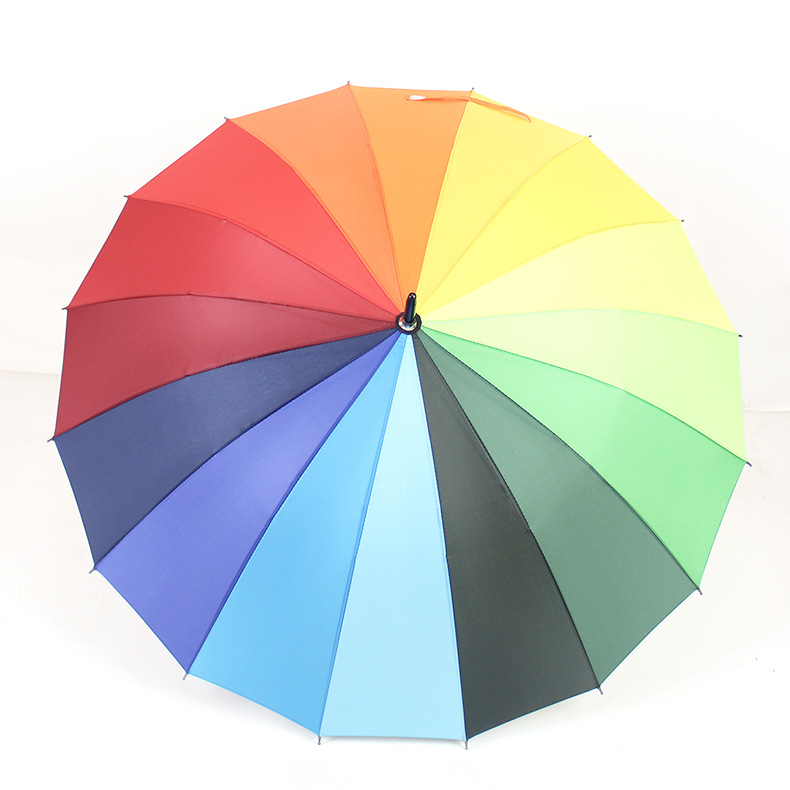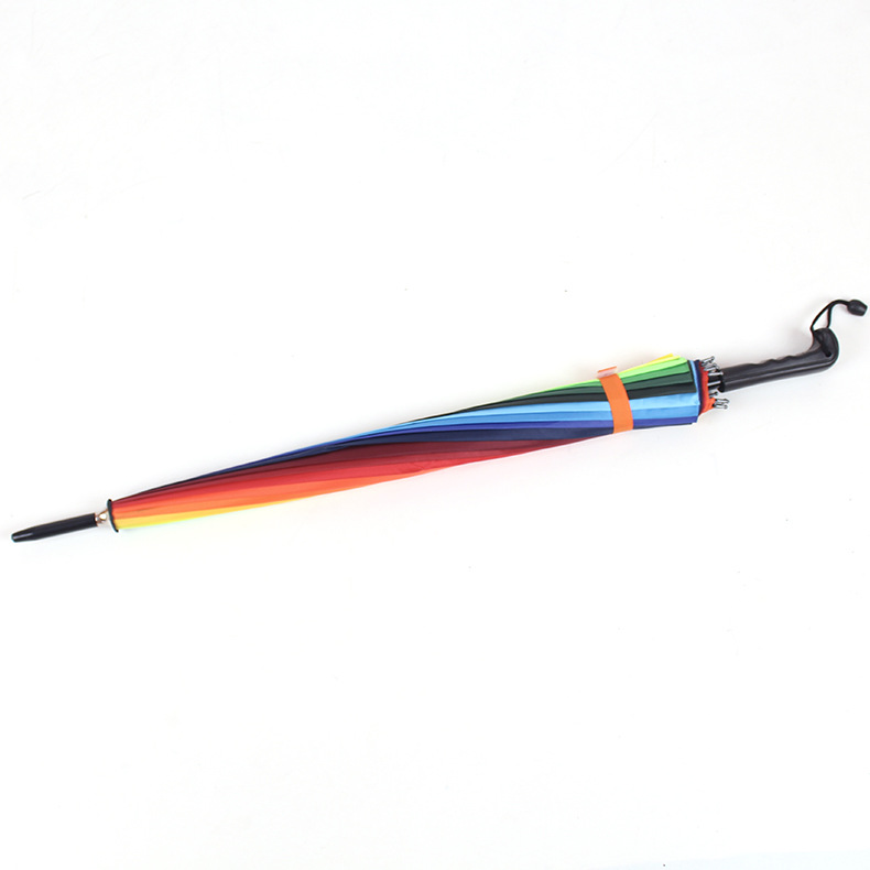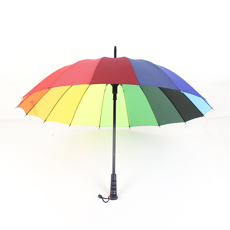 공장 직접 공급 색상 방비 선 스크린 긴 손잡이 16 뼈 무지개 우산 창조적 인 인쇄 가능한 로고 긴 손잡이 스트레이트 막대 선물 우산