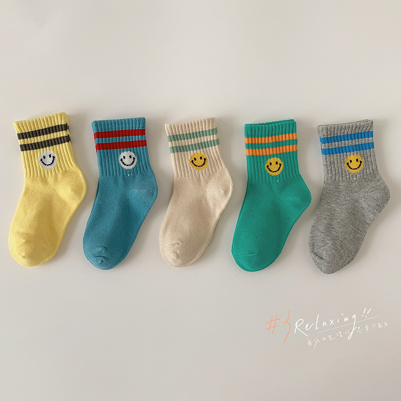 손걸랑 남녀 아동 양말 가을 겨울 인스 트렌드 한국 스타일 아동 중목 양말 스트라이프 스마일 학생 면 양말