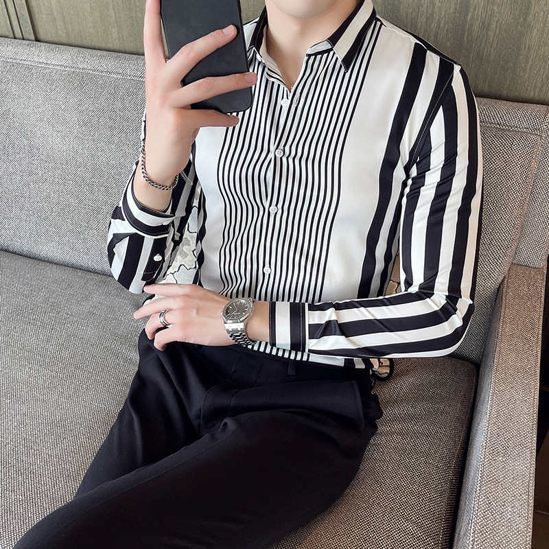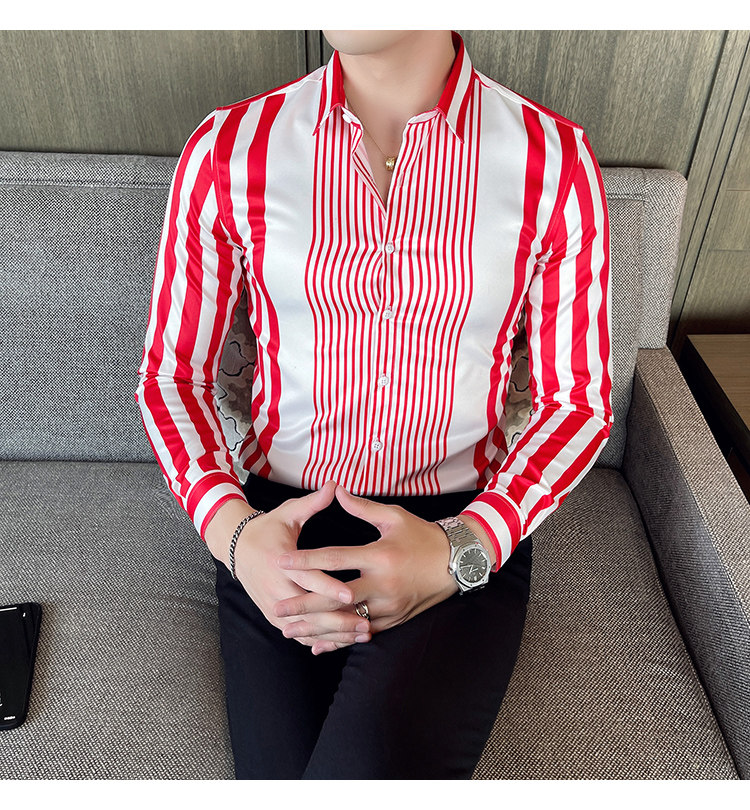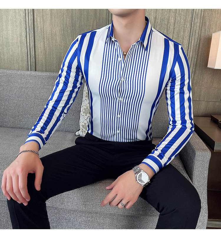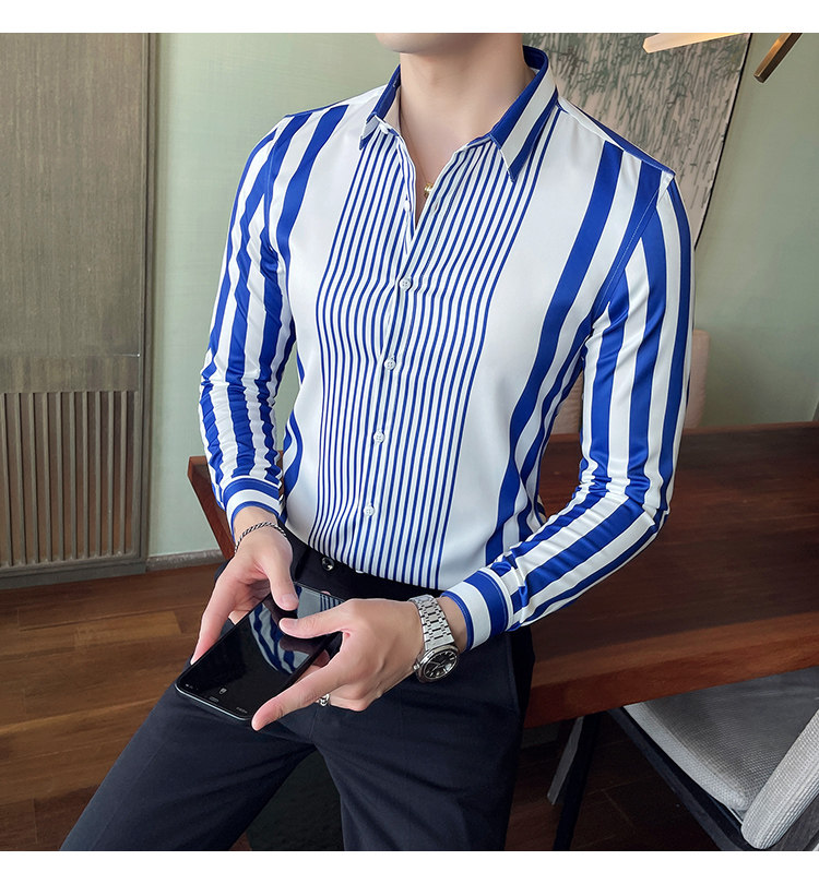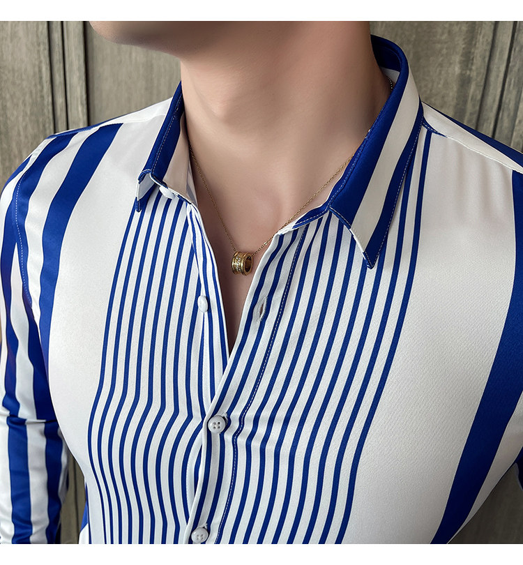 21 가을 새 남성복 브리티시 슬림핏 스트라이프 포인트 칼라 비 다림질 셔츠 긴팔 캐주얼 아이스 실크 셔츠 트렌디
