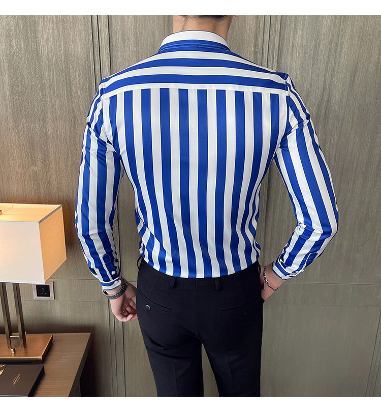 21 가을 새 남성복 브리티시 슬림핏 스트라이프 포인트 칼라 비 다림질 셔츠 긴팔 캐주얼 아이스 실크 셔츠 트렌디스토어 가기