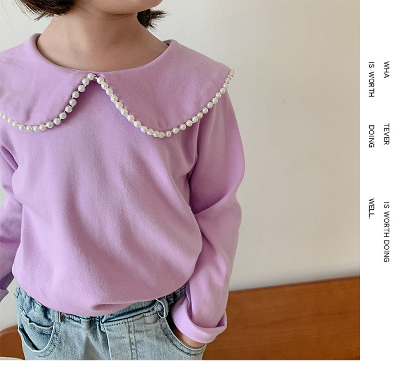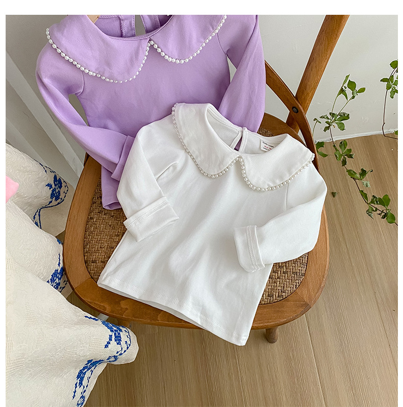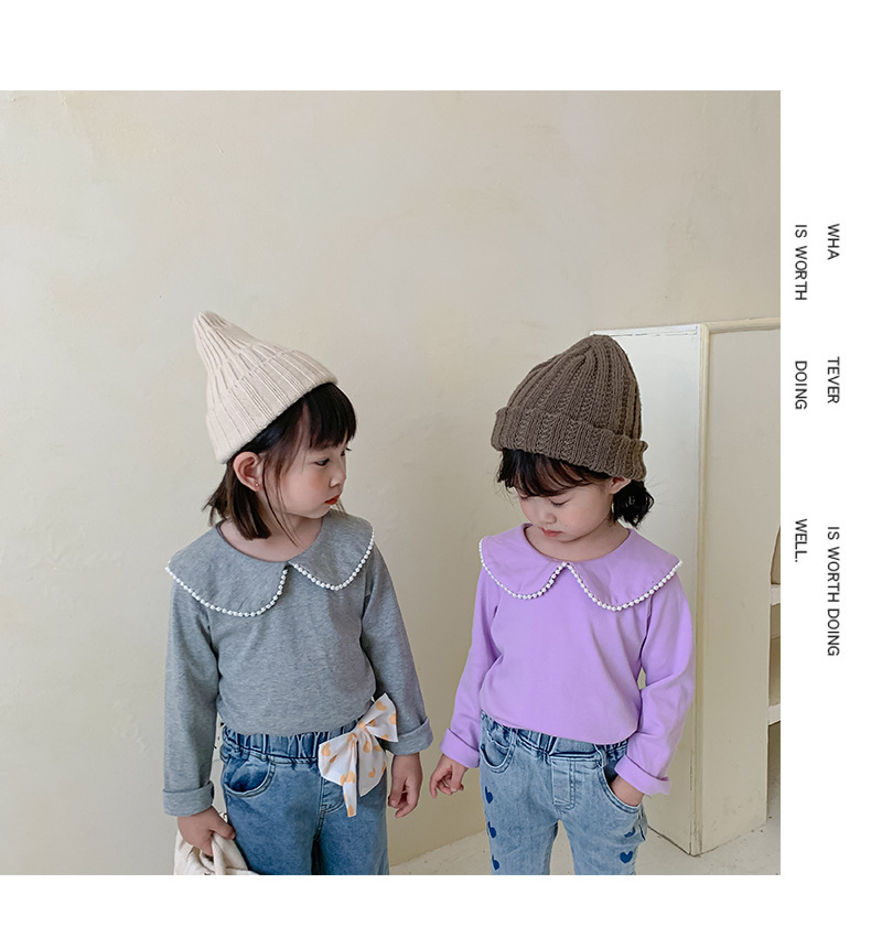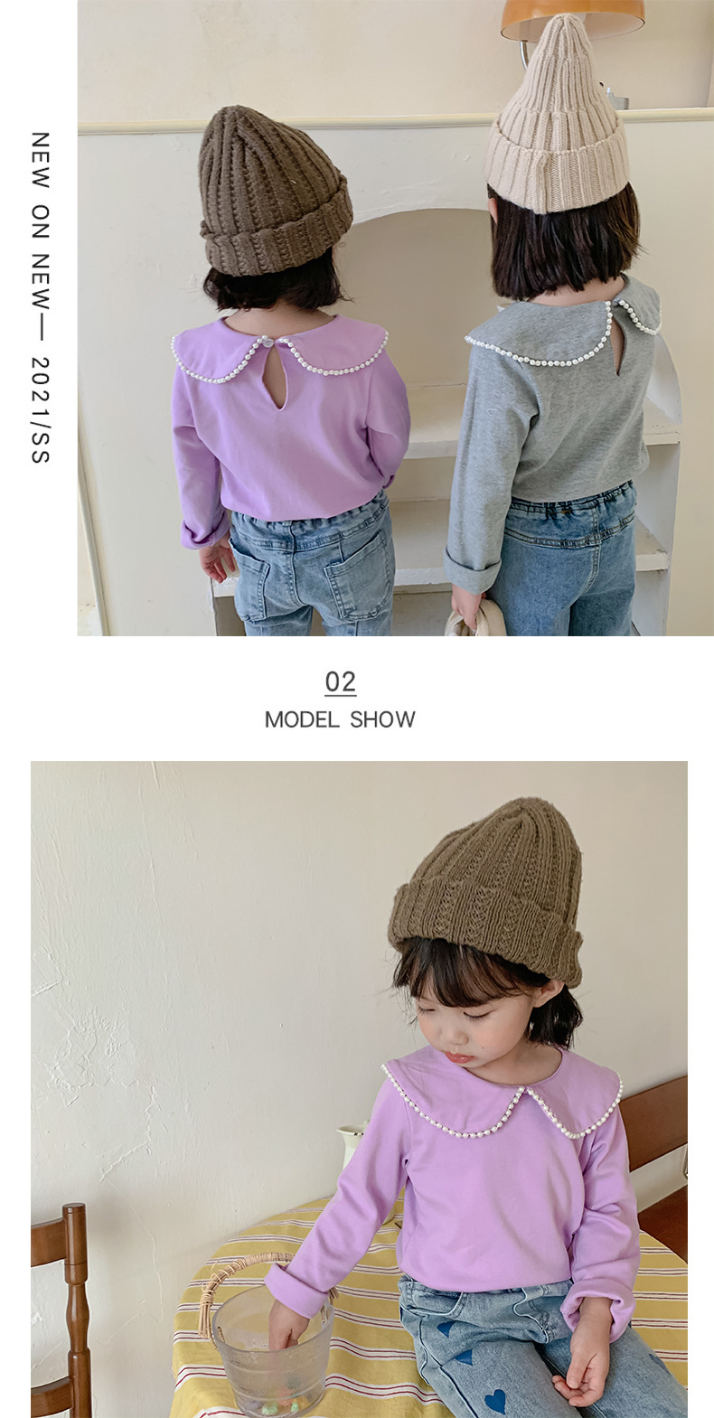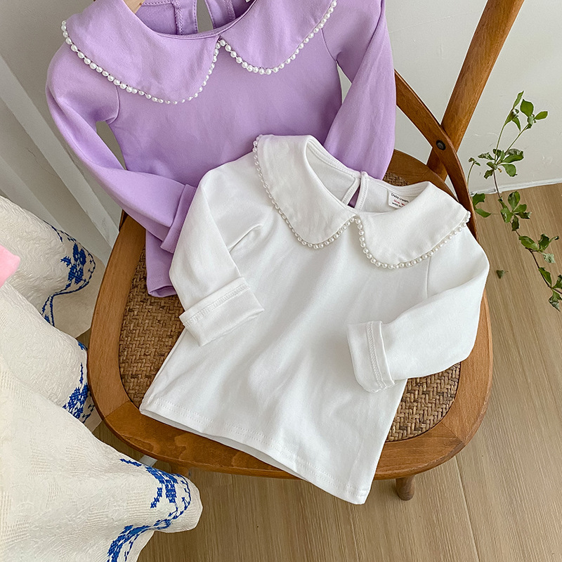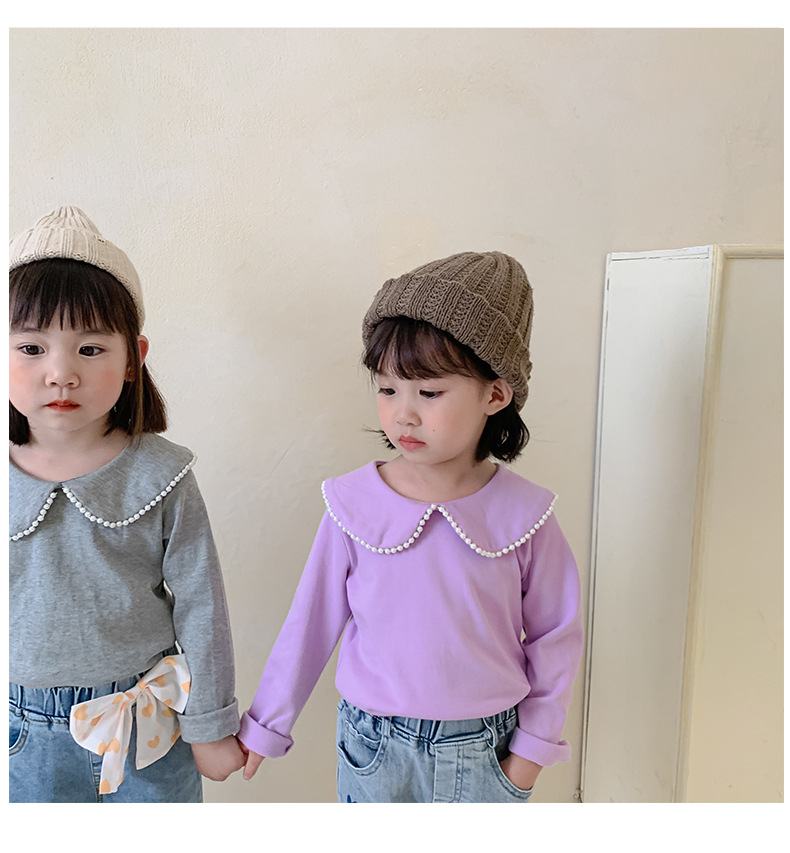 강하게 추천! Xiaoxiang 스타일 진주 여아 긴팔 티셔츠 양면 세련된 면 아동베이스 셔츠 인형 칼라 탑