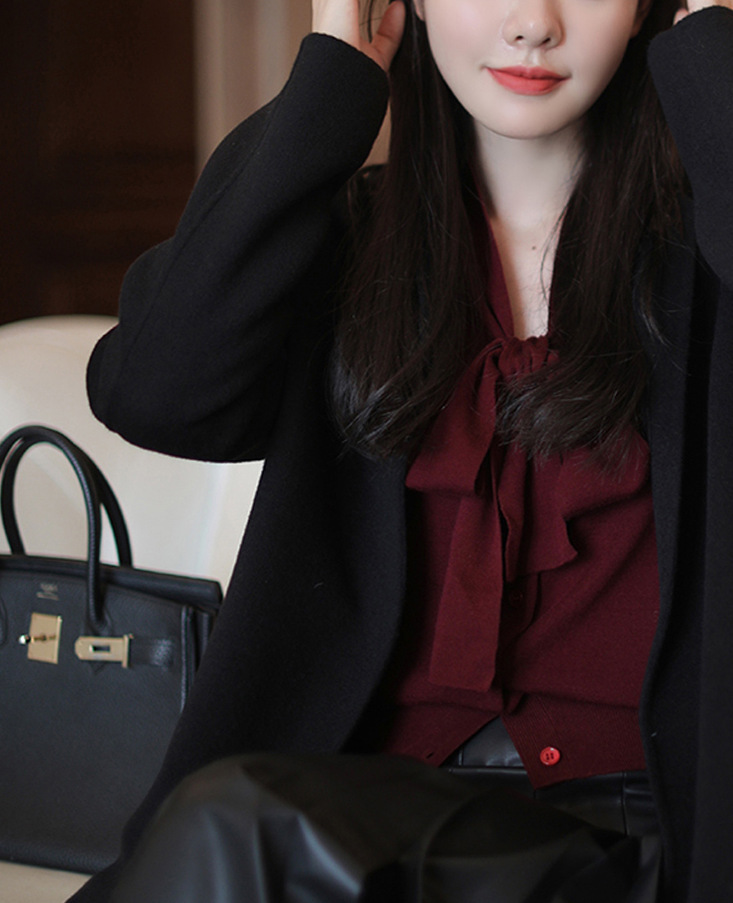 부드러운 부드러운 흰색 셔츠 리본 스웨터 울 혼방 니트 가디건