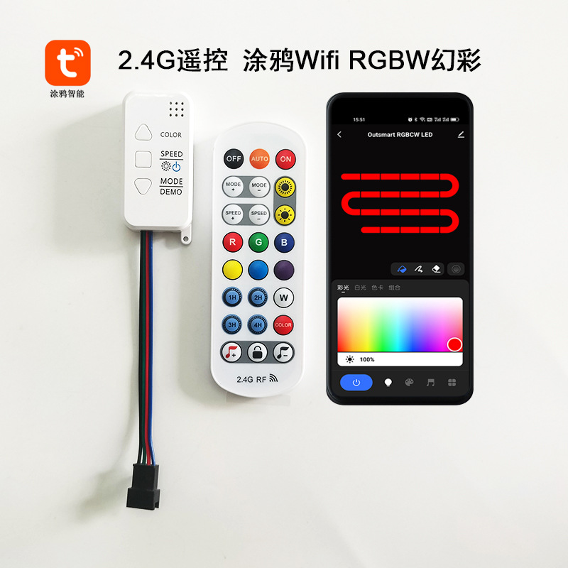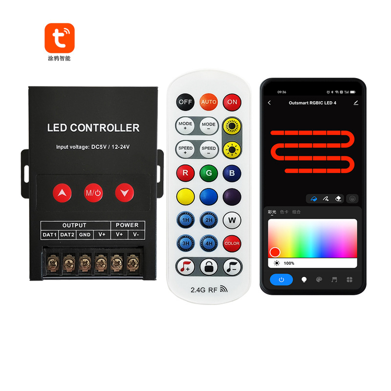 涂鸦wifi 幻彩控制器是一款采用新款wifi无线智能遥控LED控制器,适合于UCS1903,TM1804,1803,1829,2811,6803等IC型号的灯条,可广泛应用于灯箱广告、舞台布景、家居装饰等;具有接线方便,使用简单等优点;具有记忆存储功能;可通过红外遥控进行模式选择,亮度调节,速度调节等灯光动态变化效果。由智能手机APP控制改变灯带的静态颜色和动态模式,调节灯带亮度。本产品可多设备智能联动,可使用亚马逊Alexa和谷歌助理(Google Home)语音控制,本产品还具有外置声控和APP声控功能,灯光可跟随音乐节奏变化而变化。