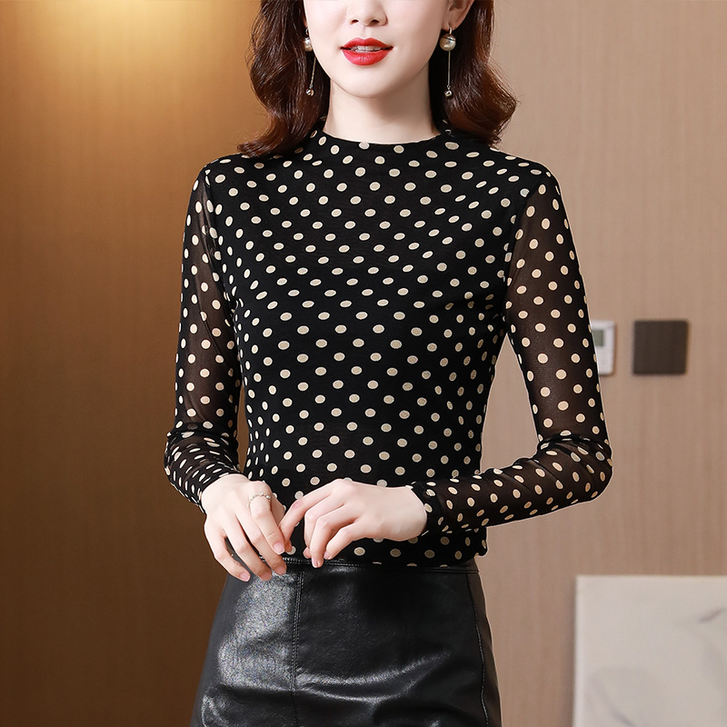 긴팔 메쉬 티셔츠 여성용 2023 가을 얇은 폴 도트 탑 스트레치 슬림핏 우아한 하프 하이 칼라 세련된 셔츠