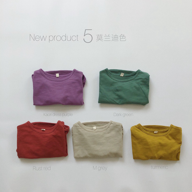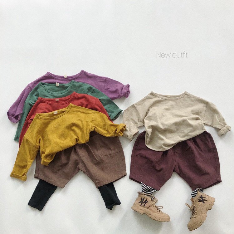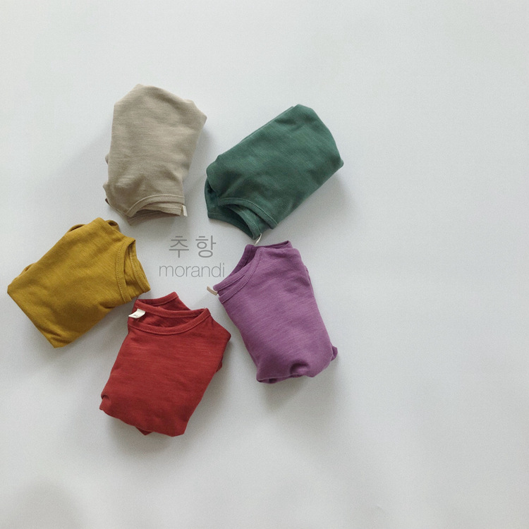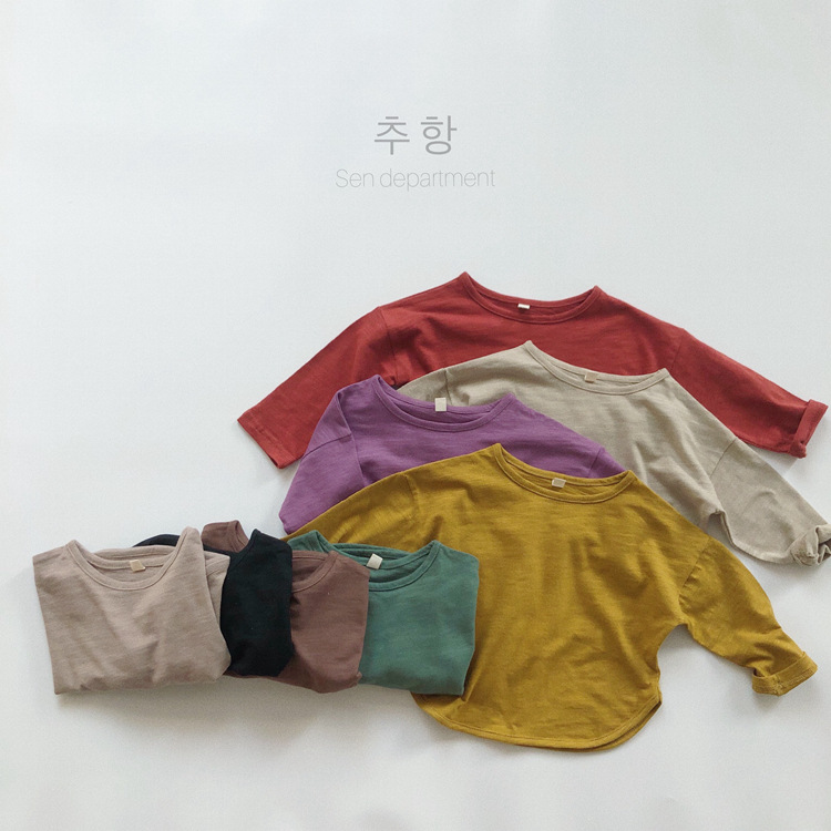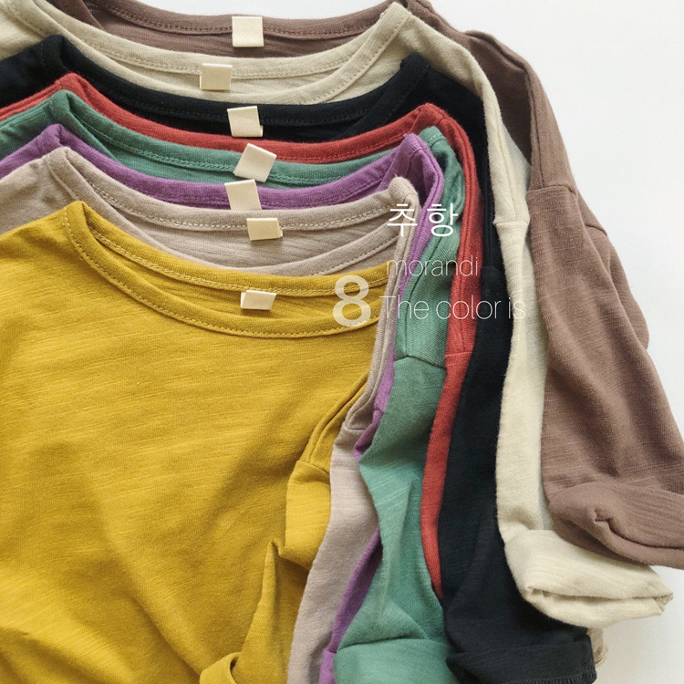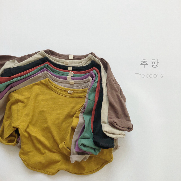 모란디 기본 가을 새로운 어린이 한국 베이스 셔츠 소년 소녀 슬러브 코튼 베이스 셔츠를위한 크루넥 탑스토어 가기