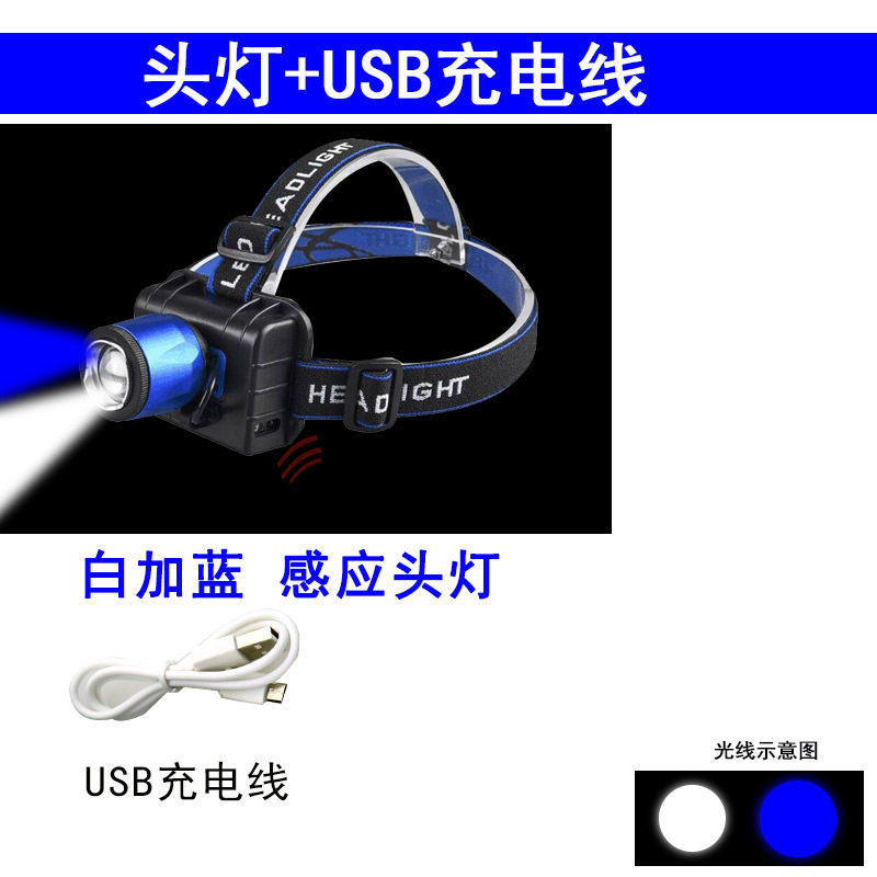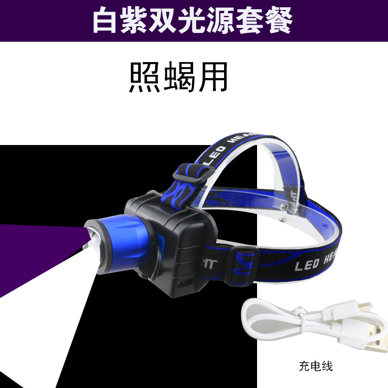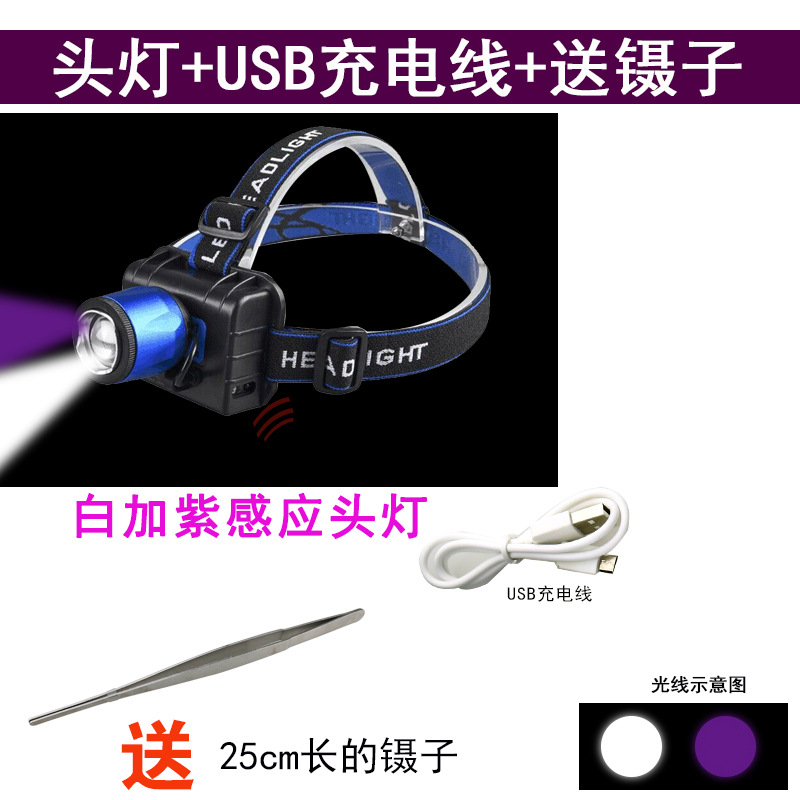 유도 퍼플 라이트 USB 충전 옥외 충전 보물 화이트 블루 전기 디스플레이 전조등 퍼플 화이트 더블 라이트 헤드 파악 퍼플 라이트 착용 퍼플 라이트 라이트