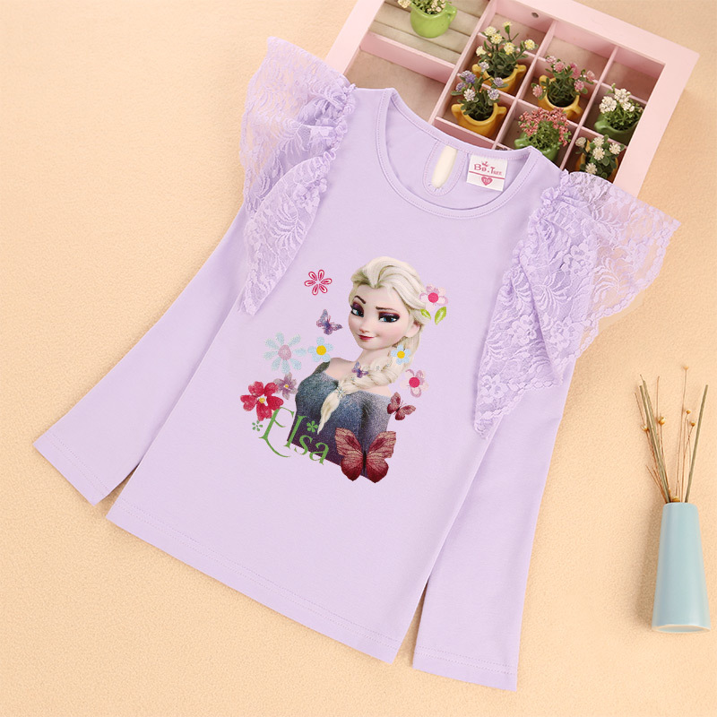 여아 레이스 슬리브 긴 소매 티셔츠 어린이 비행 슬리브 탑 봄과 가을 얇은 라운드 넥 티셔츠 겨울왕국 핑크 면 티셔츠스토어 가기