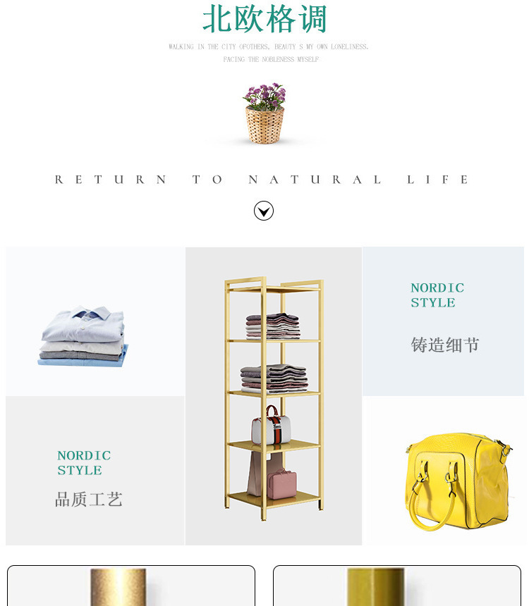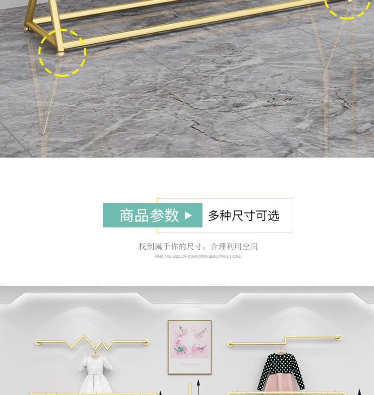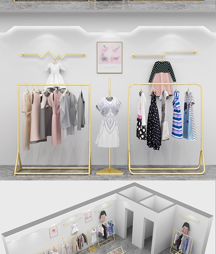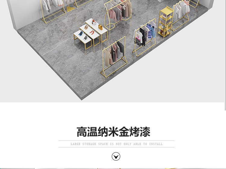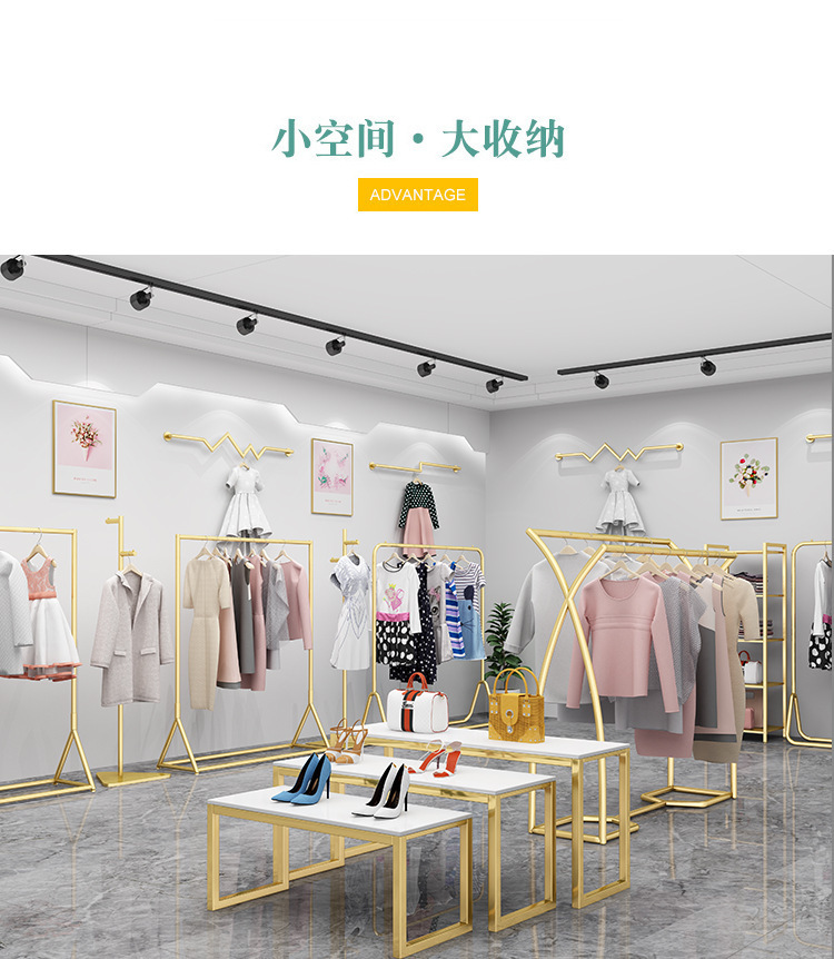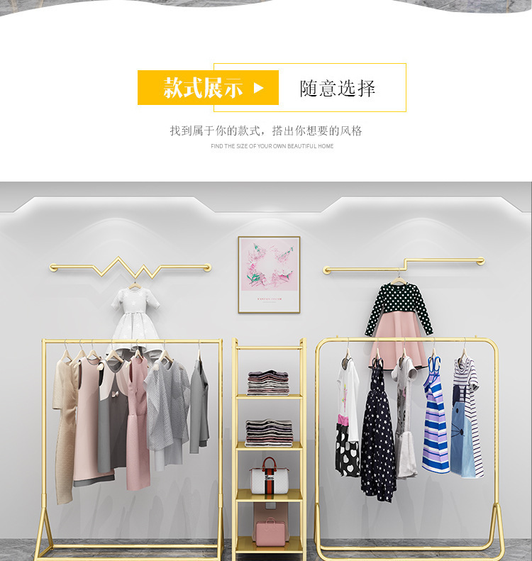 의류 매장 디스플레이 랙 플로어 스탠딩 황금 의류 랙 여성 의류 매장 선반 사이드 랙 프론트 랙 철 걸이스토어 가기