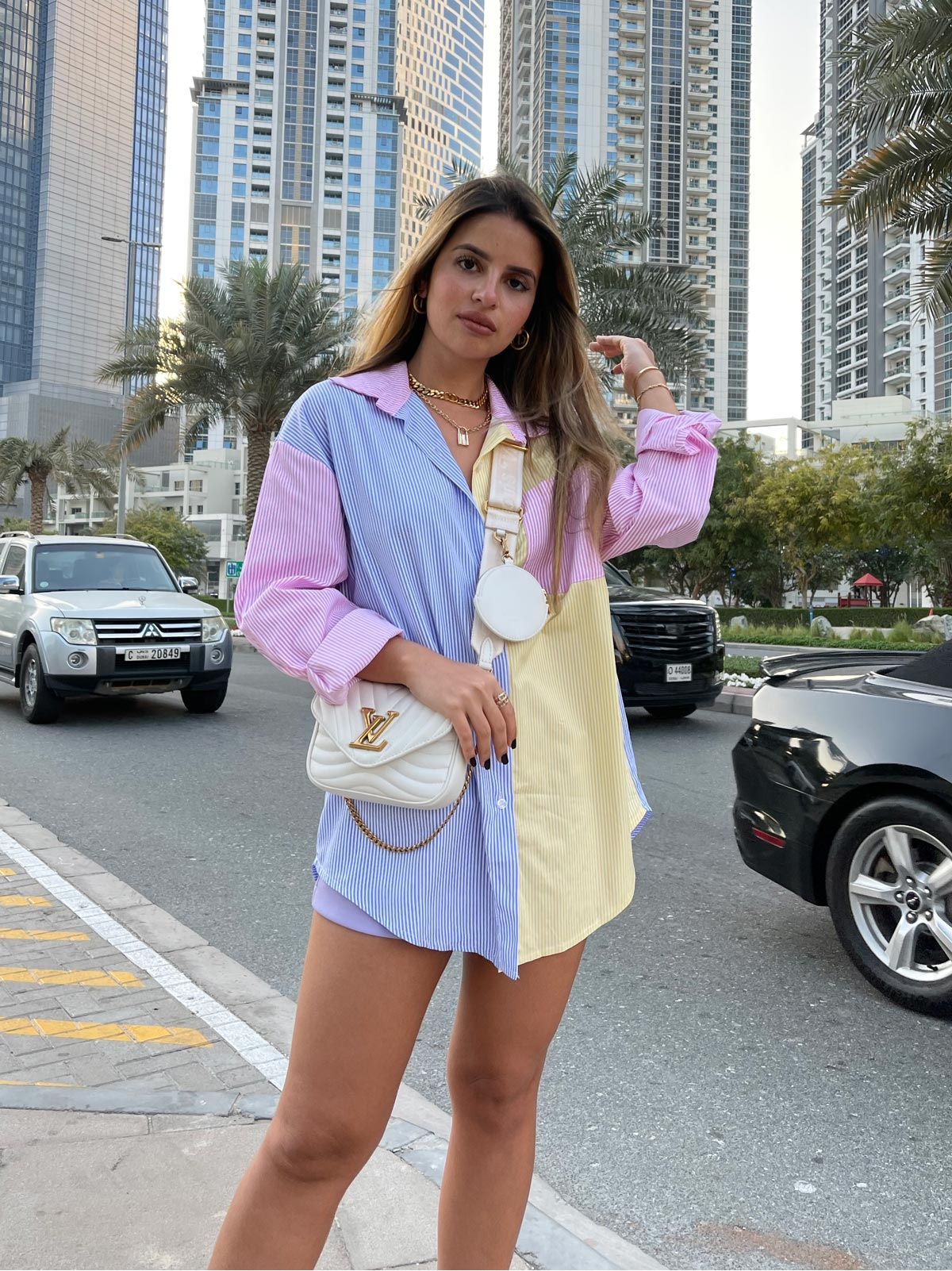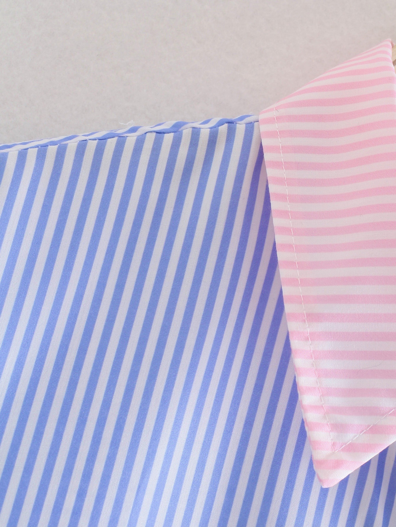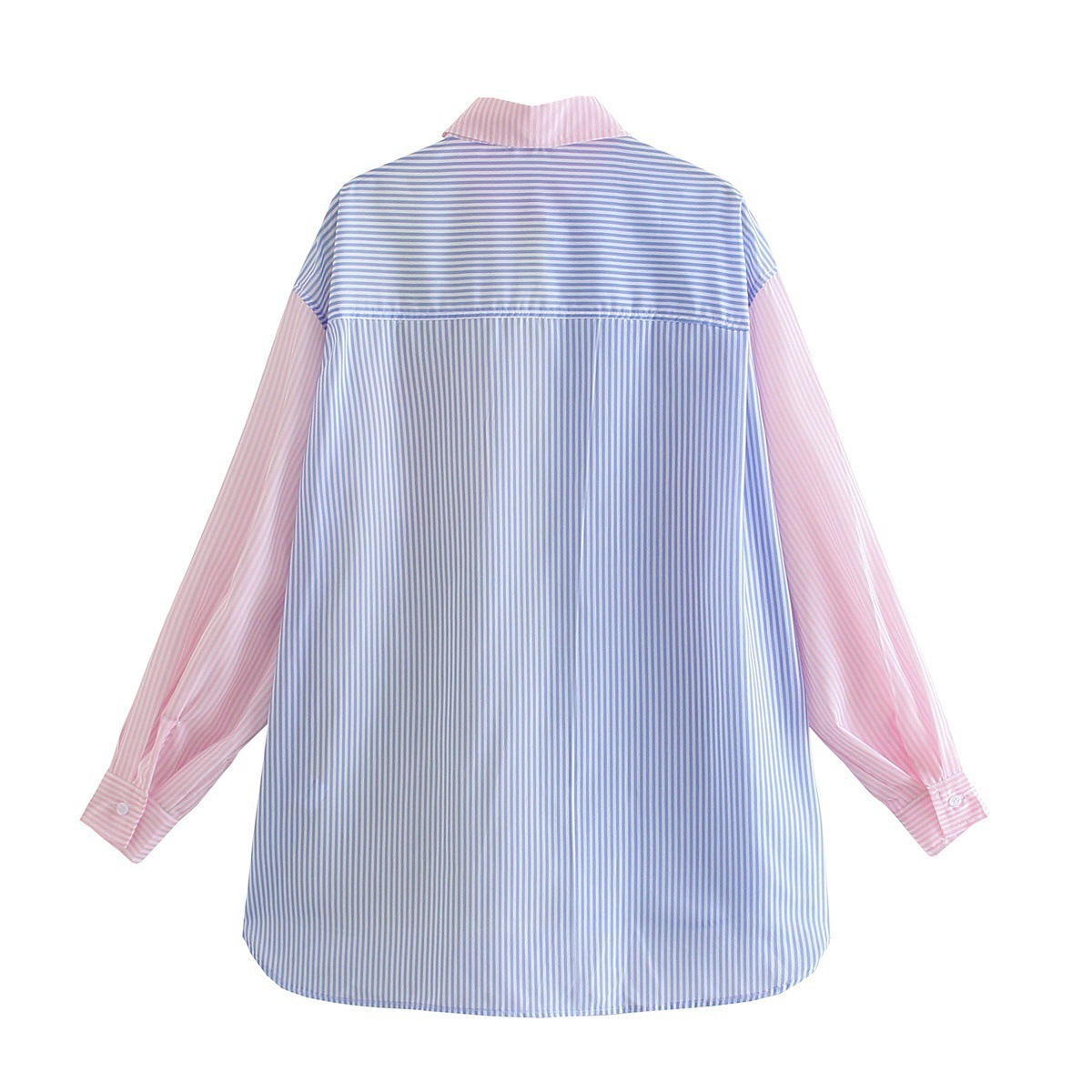 欧美2021春季三色拼接拼色长袖宽松女式衬衫上衣R5-43508