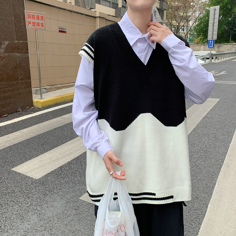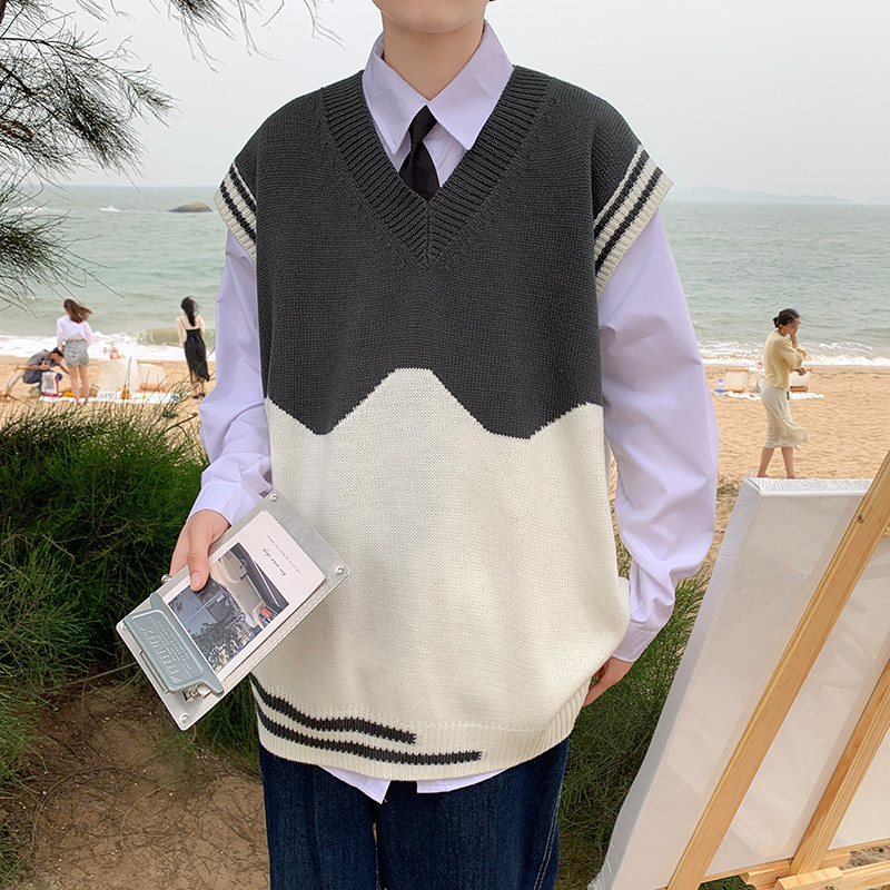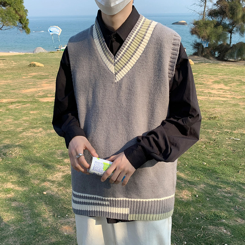 봄 가을 민소매 니트 조끼 남성용 루즈핏 한국 스타일 대학풍 브이넥 니트웨어 커플용 조끼 캐주얼스토어 가기