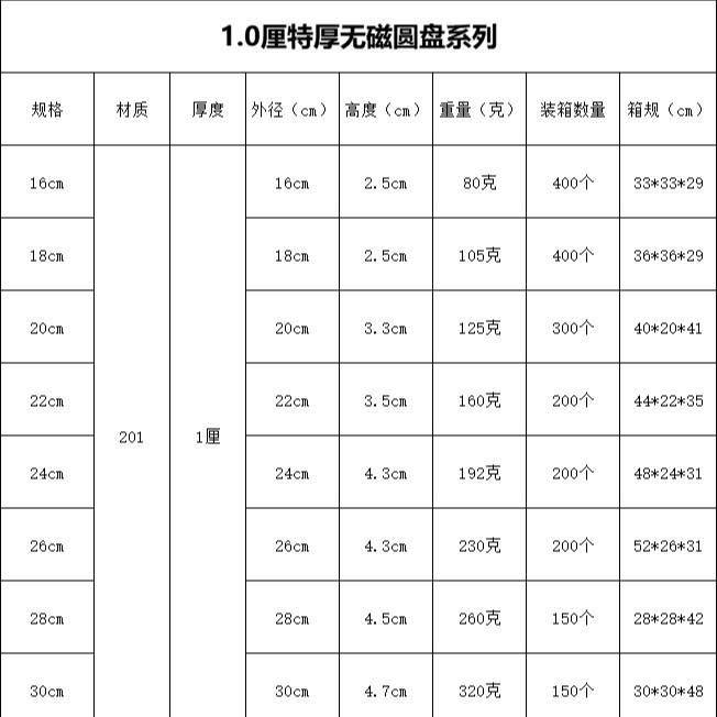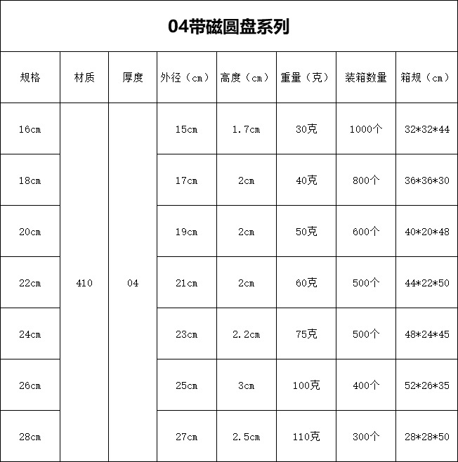 4:410带磁不锈钢材质汤盆圆盘类产品,偶尔会在盆或者边侧面或稍微有点皱或者稍微有点瑕疵均不属于质量问题,因带磁材质比无磁材质偏硬液压机械拉升过程中1000个盆或者盘中偶尔会导致有几个或者十几稍微皱或者有点瑕疵,介意者请慎重拍下,谢谢!!!