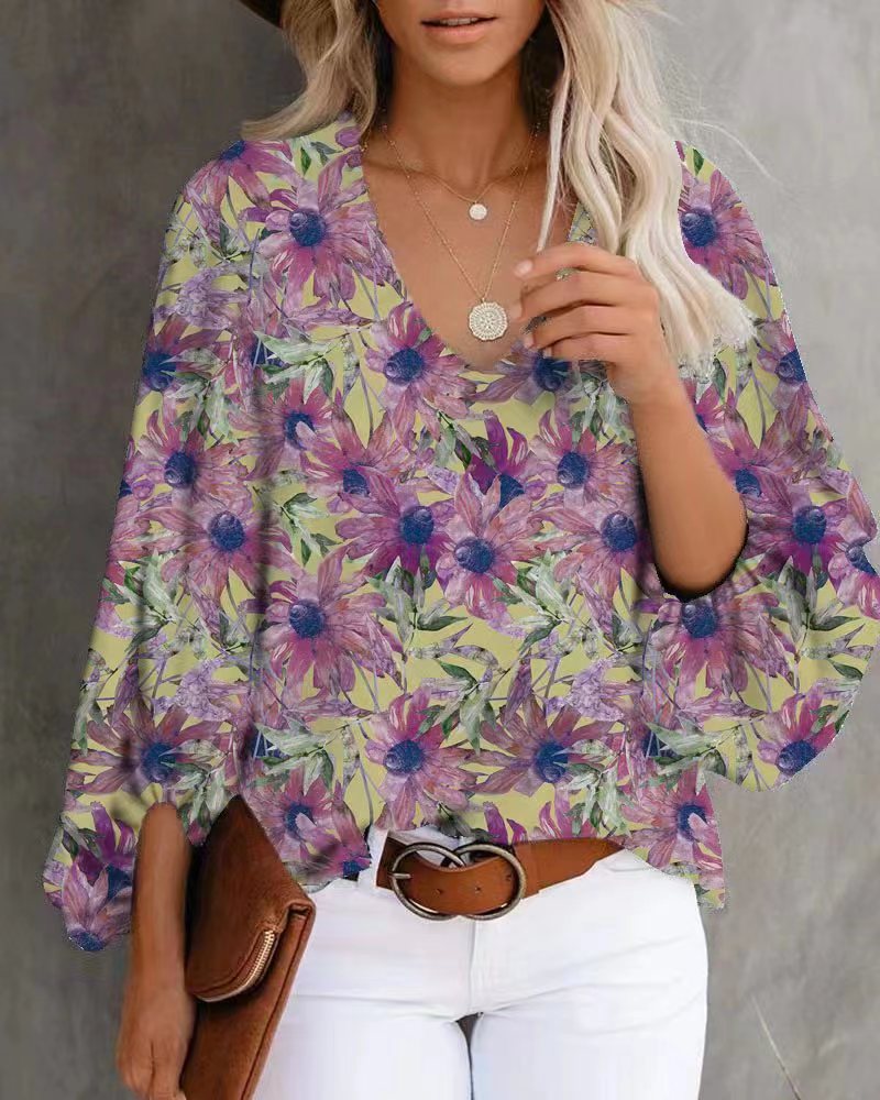 2023 새로운 유럽과 미국 아마존 크로스 보더 봄 여름 가을 V-넥 캐주얼 셔츠 프린트 랜턴 슬리브 탑 여성 의류스토어 가기