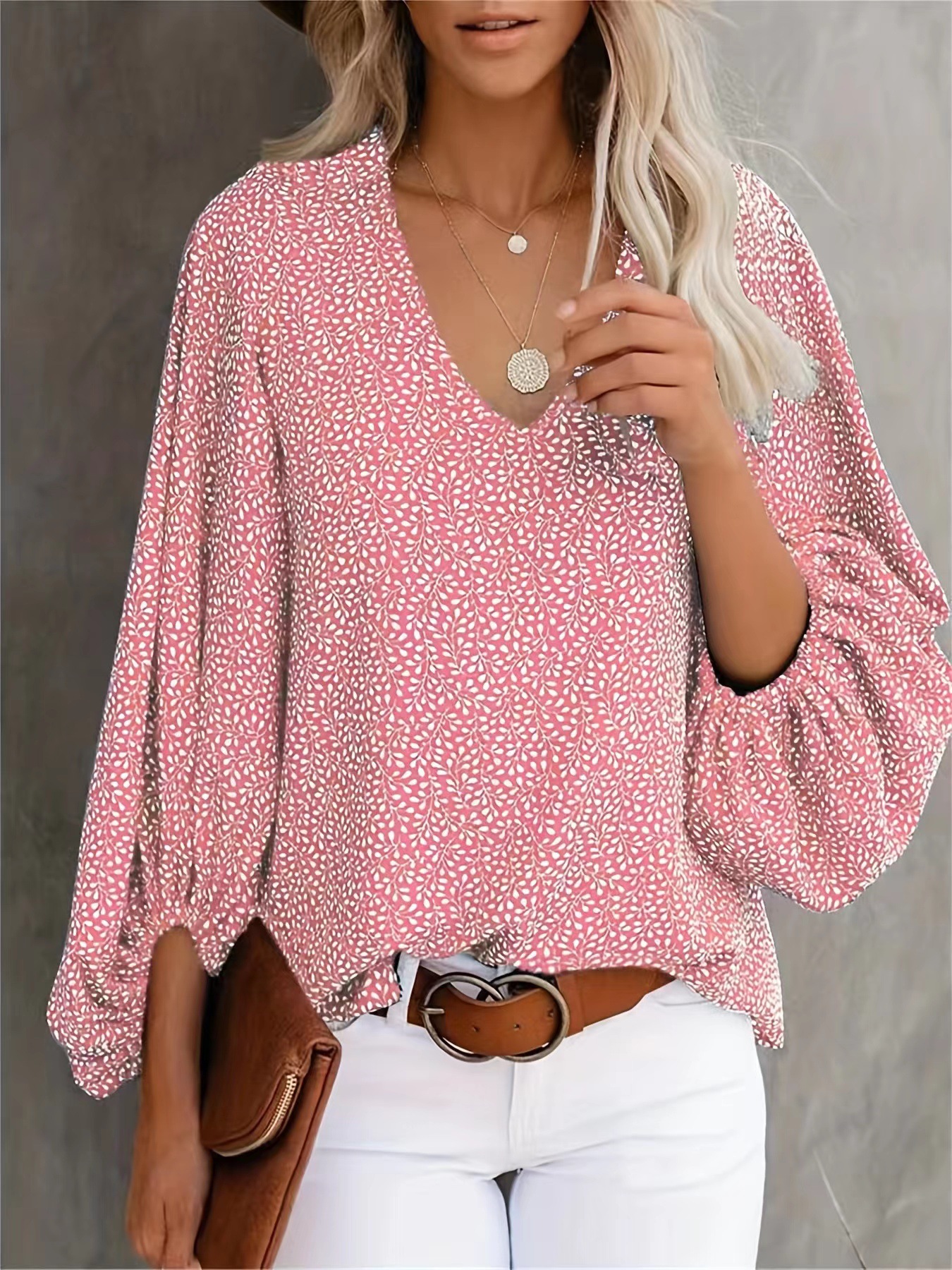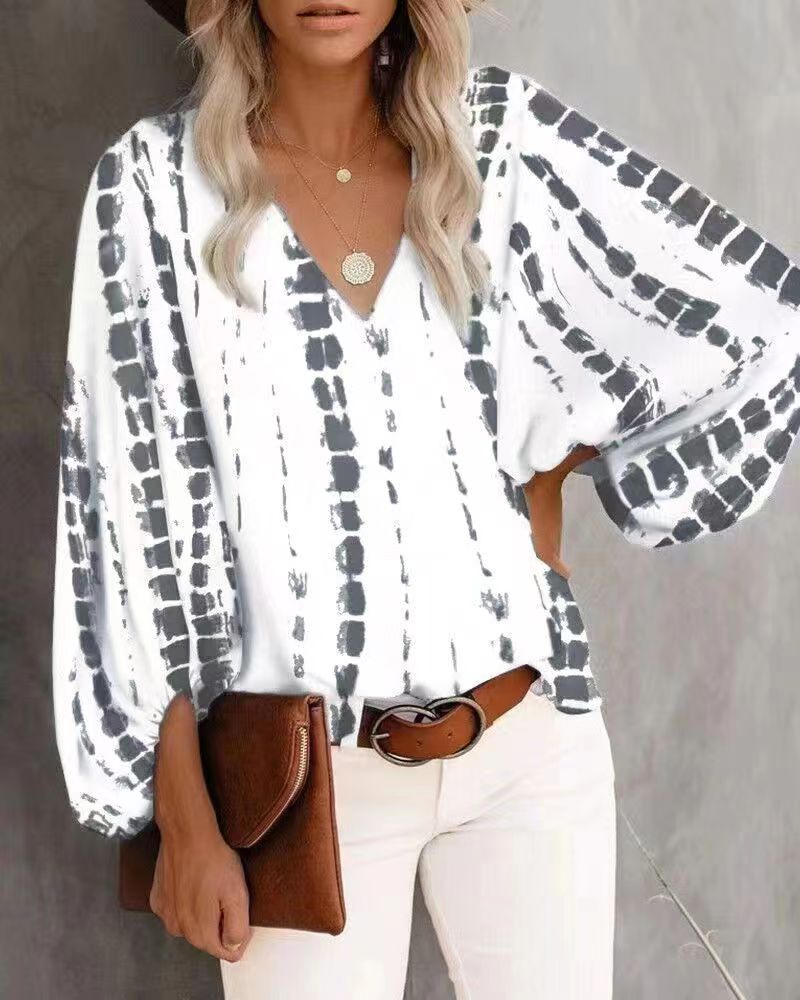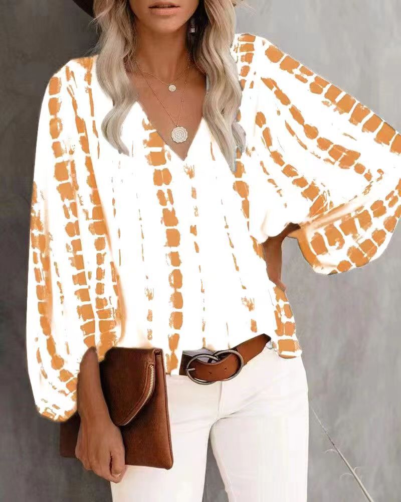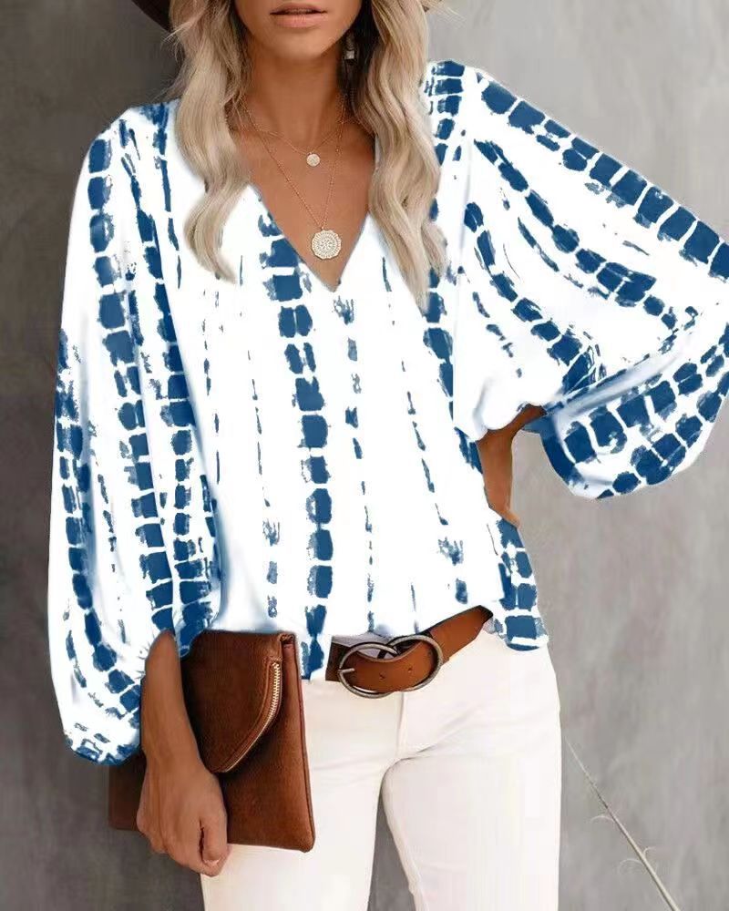 2023 새로운 유럽과 미국 아마존 크로스 보더 봄 여름 가을 V-넥 캐주얼 셔츠 프린트 랜턴 슬리브 탑 여성 의류