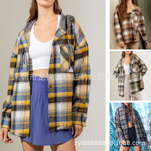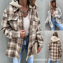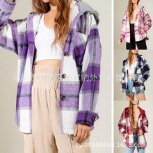 欧美爆款2023eBay亚马逊秋冬新款女装 时尚连帽格子衬衫毛呢外套