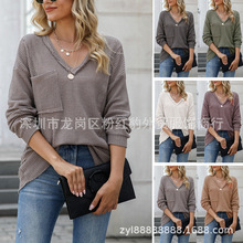 跨境新品2023ebay亚马逊春季华夫格女装 欧美性感V领长袖打底衫
