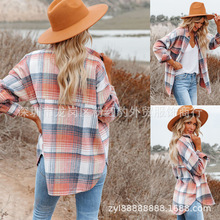 欧美爆款2023ebay亚马逊冬季新款女装时尚格子磨毛呢长款衬衣外套