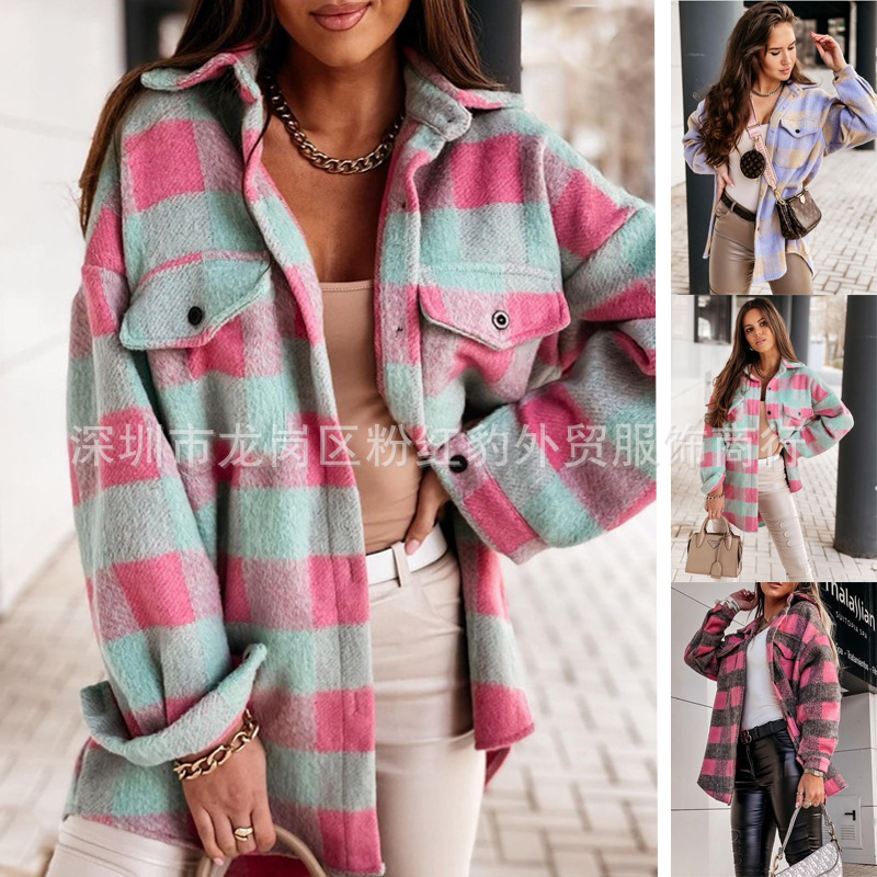 欧美爆款2023ebay亚马逊wish秋冬新品时尚大格子衬衣女式毛呢外套