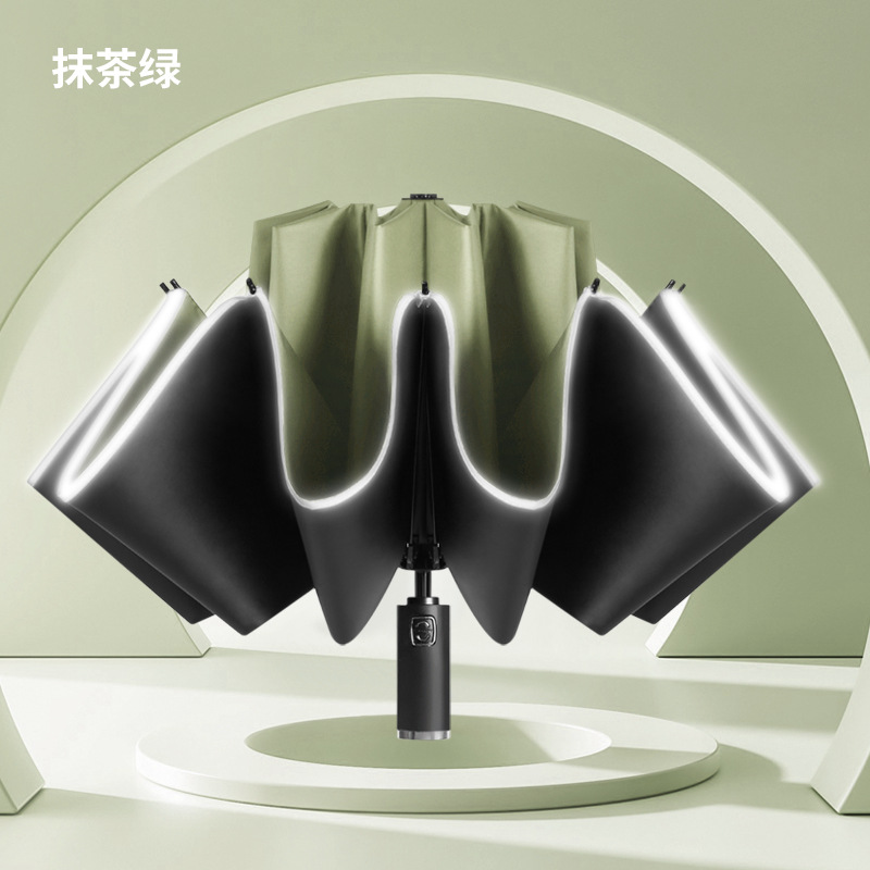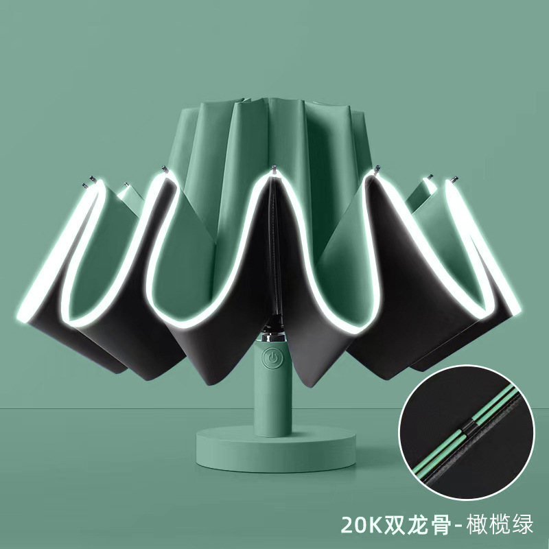 • 올리브 그린 LED10 뼈 반전 우산 전체 덮음 검은 접착제