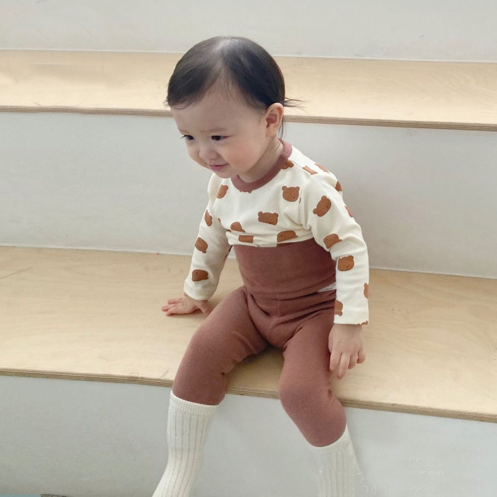 2021 가을 새로운 아기 귀여운 곰 인쇄 긴 소매 바닥 셔츠 배꼽 바지 세트 남성과 여성 아기 가정 옷스토어 가기