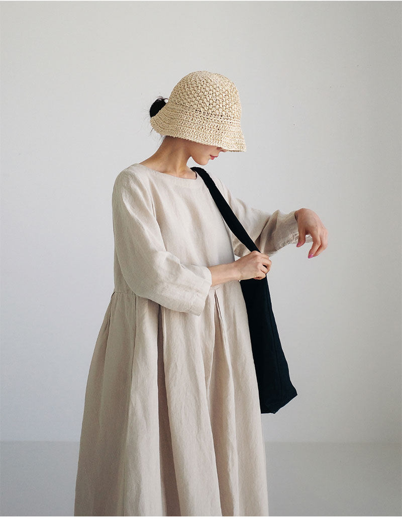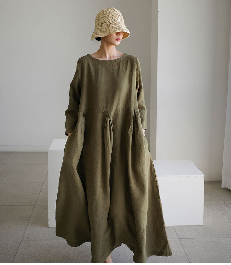 2024 루즈 플러스 사이즈 드레스 일본 한국 스타일 코튼과 린넨 라운드 넥 풀오버 솔리드 컬러 대형 스윙 스커트스토어 가기