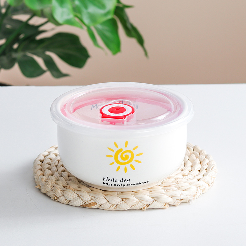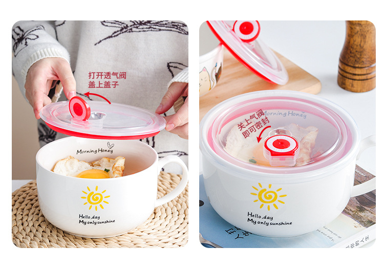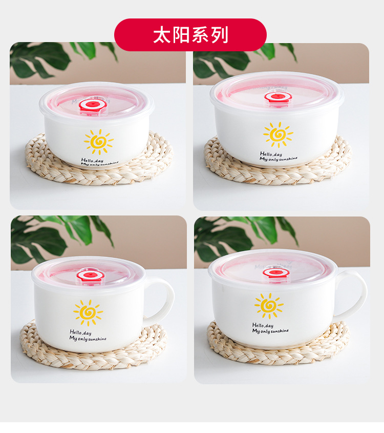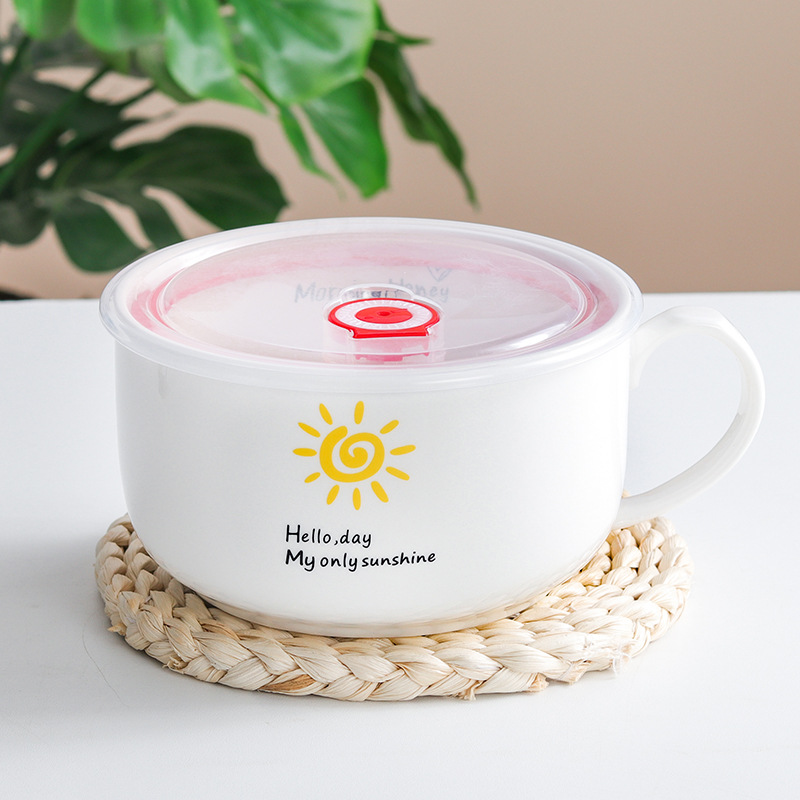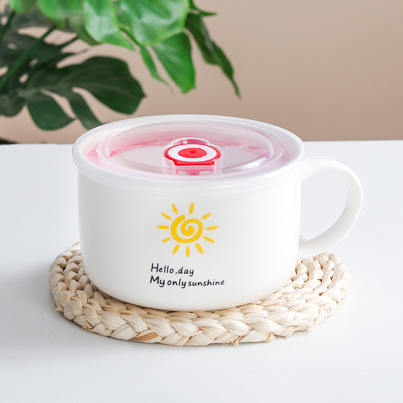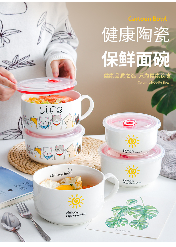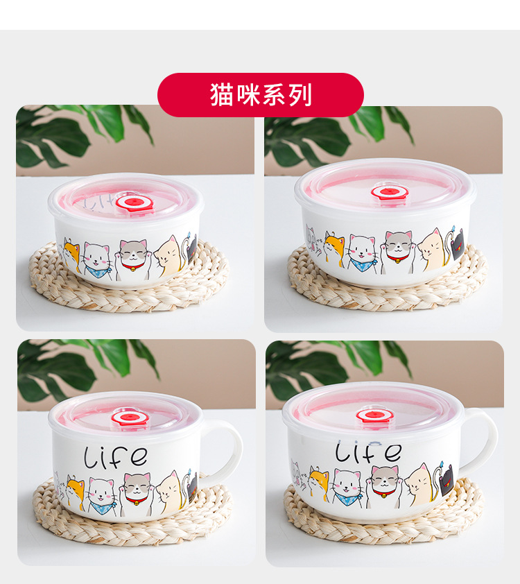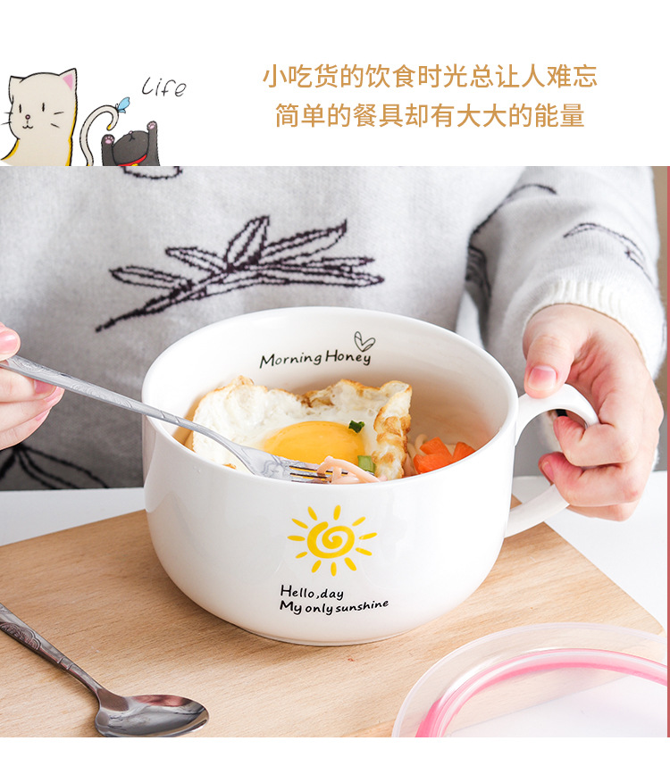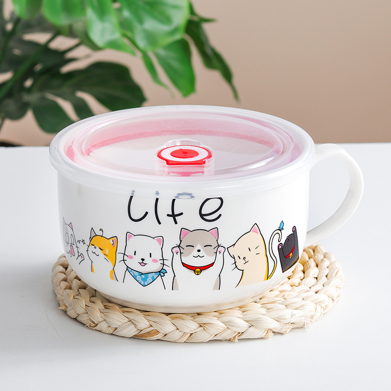 뚜껑이있는 일본식 만화 세라믹 인스턴트 국수 그릇 아침 식사 컵 학생 기숙사 손잡이가있는 대형 귀리 컵 고정 가능 로고