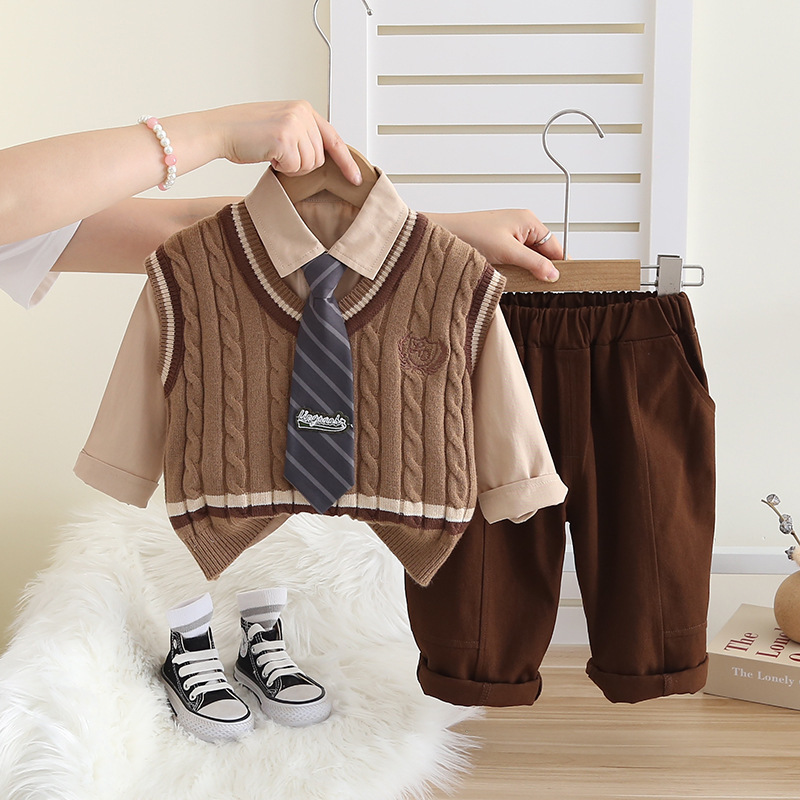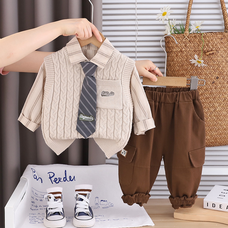 소년 스웨터 조끼 봄과 가을의 3 피스 한국어 버전 새로운 잘 생긴 남성 아기 봄 의류 어린이 세트 도매의 한국어 버전