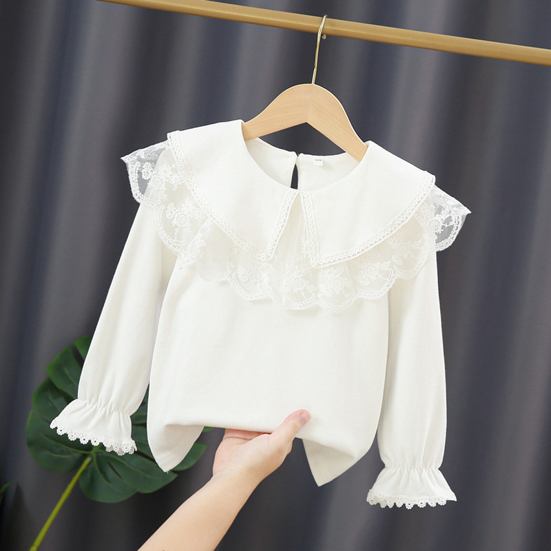 2024 봄 새 여자 긴팔 바닥 셔츠 어린이 순수 코튼 레이스 인형 칼라 공주 탑 티셔츠 5
