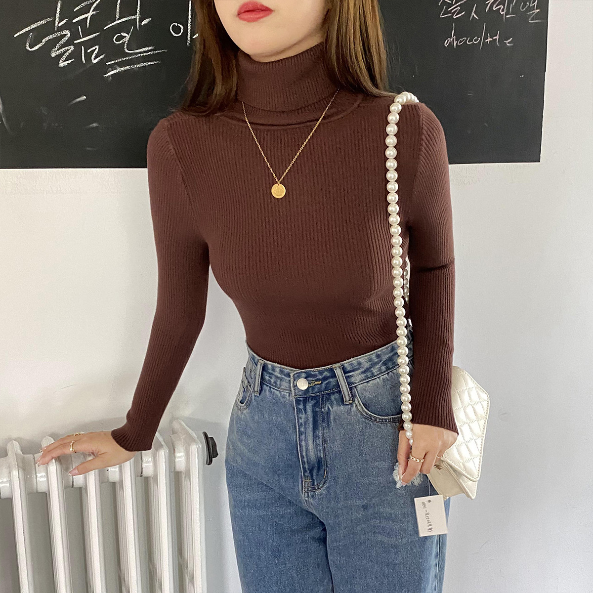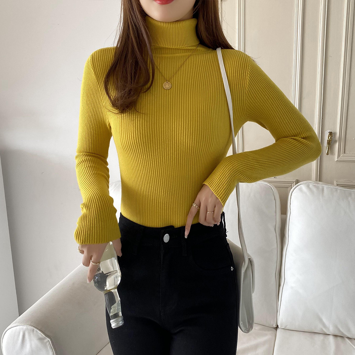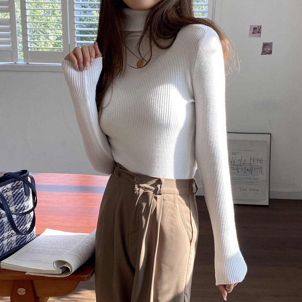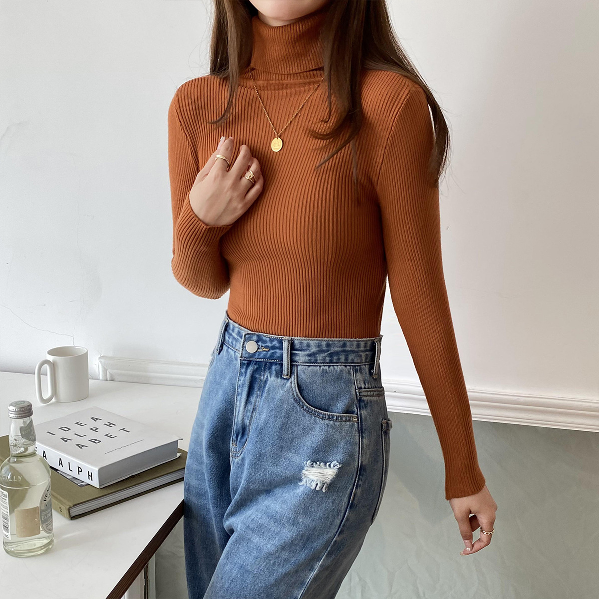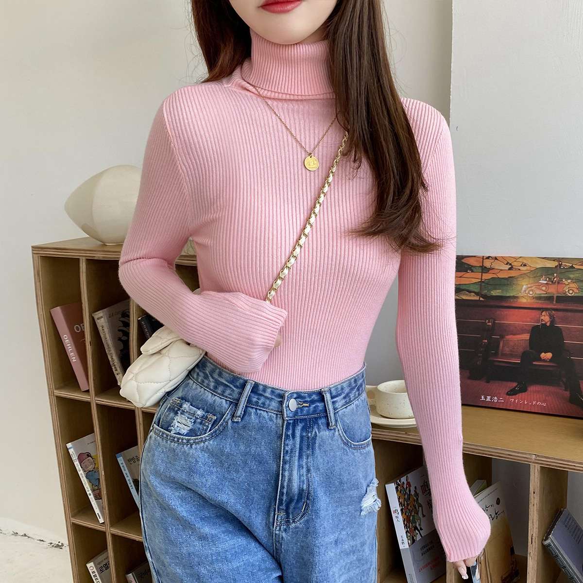 가을과 겨울 2024 새로운 여자 한국 단색 기본 올매치 두꺼운 니트 셔츠 높은 칼라 긴 소매베이스 셔츠스토어 가기