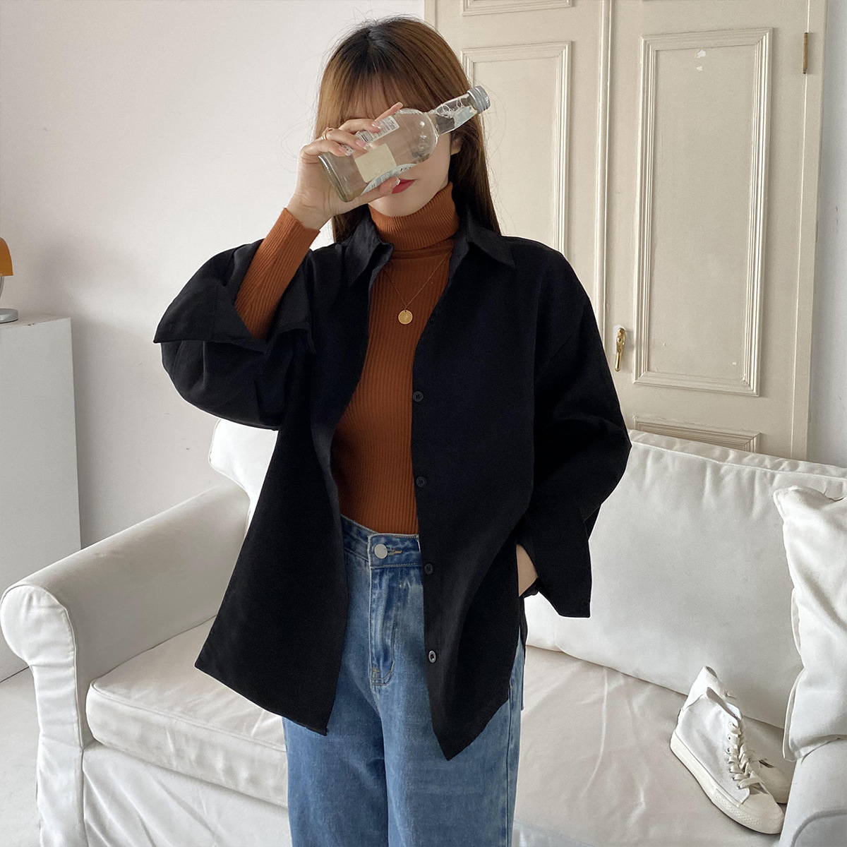 가을과 겨울 2024 새로운 여자 한국 단색 기본 올매치 두꺼운 니트 셔츠 높은 칼라 긴 소매베이스 셔츠
