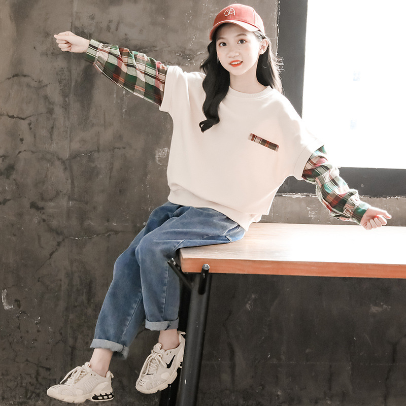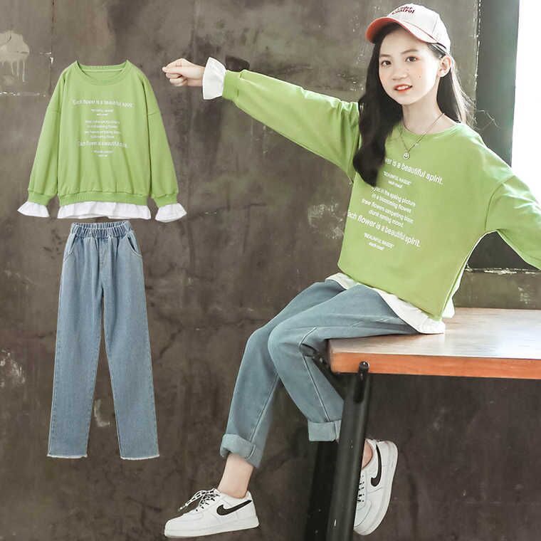 여아 가을 세트 2021 새로운 인터넷 연예인 스포츠 레저 웨스턴 스타일 봄과 가을 어린이 스웨터 청바지 투피스 세트