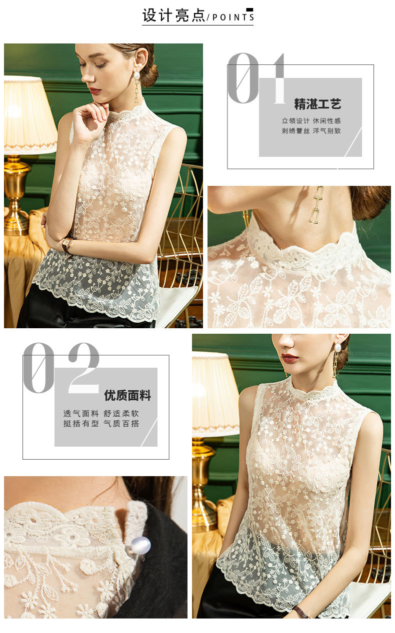 여성을위한 서 칼라와 가을 새로운 스타일 민소매 레이스베이스 셔츠 느슨한 자수 스타일 내부 자수 조끼 섹시