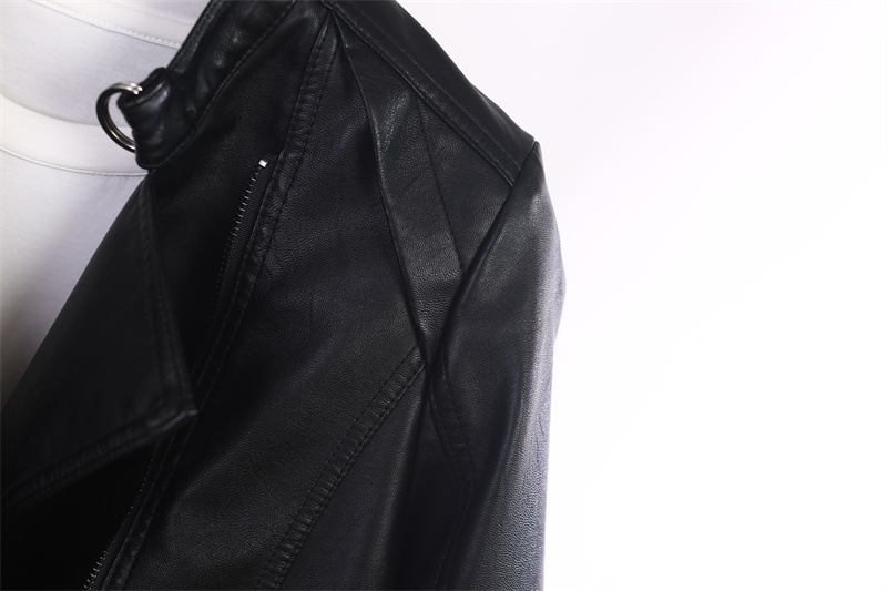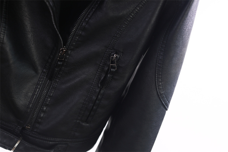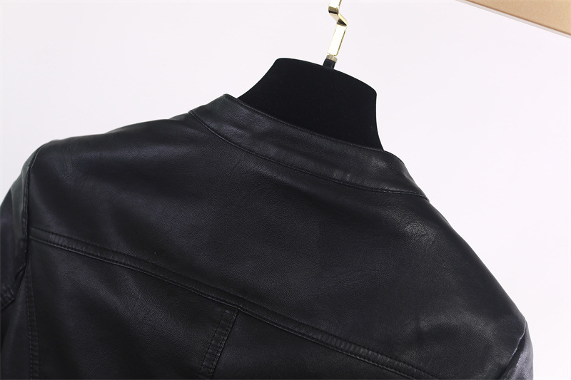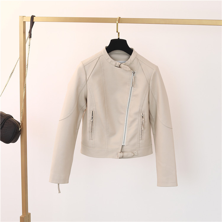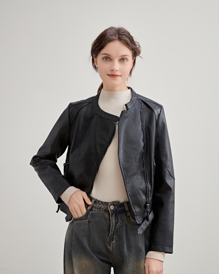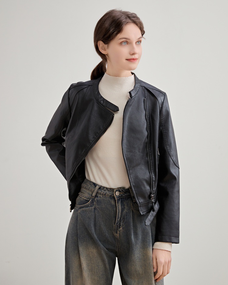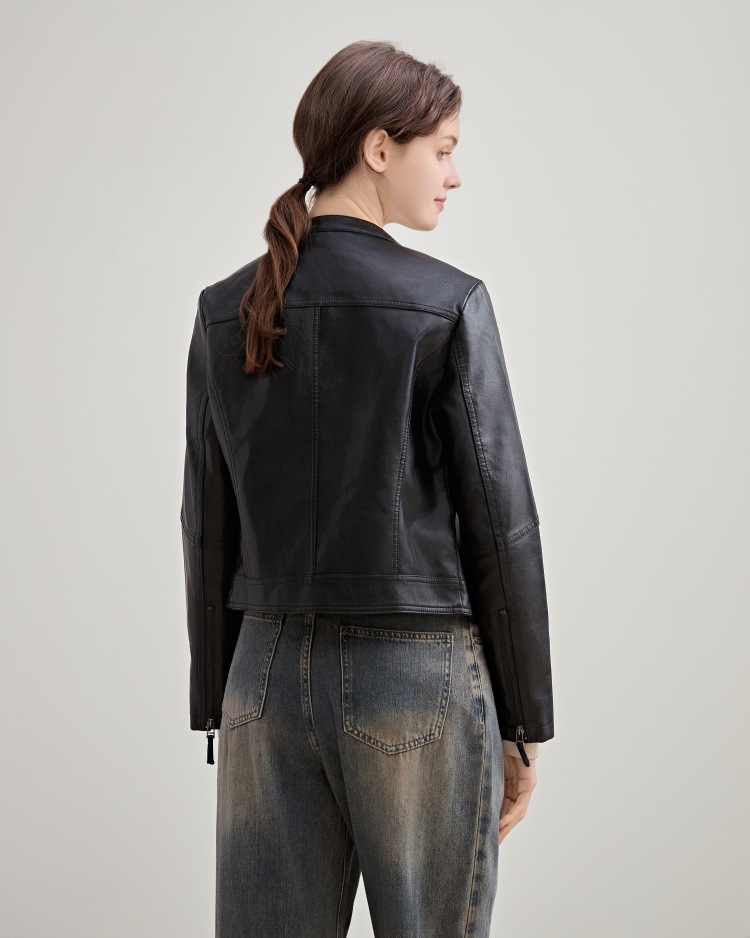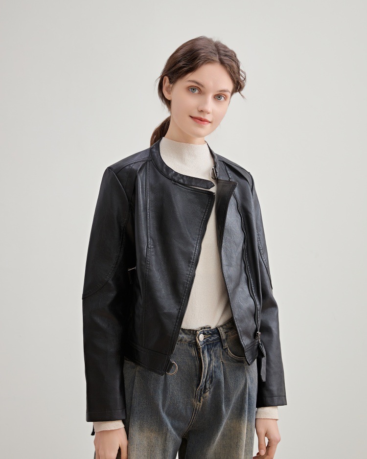 2025 봄, 가을 여성 가죽 자켓 스탠드 칼라 슬림 피트 PU 워시 가죽 오토바이 스타일 가죽 자켓 다목적 짧은 자켓스토어 가기